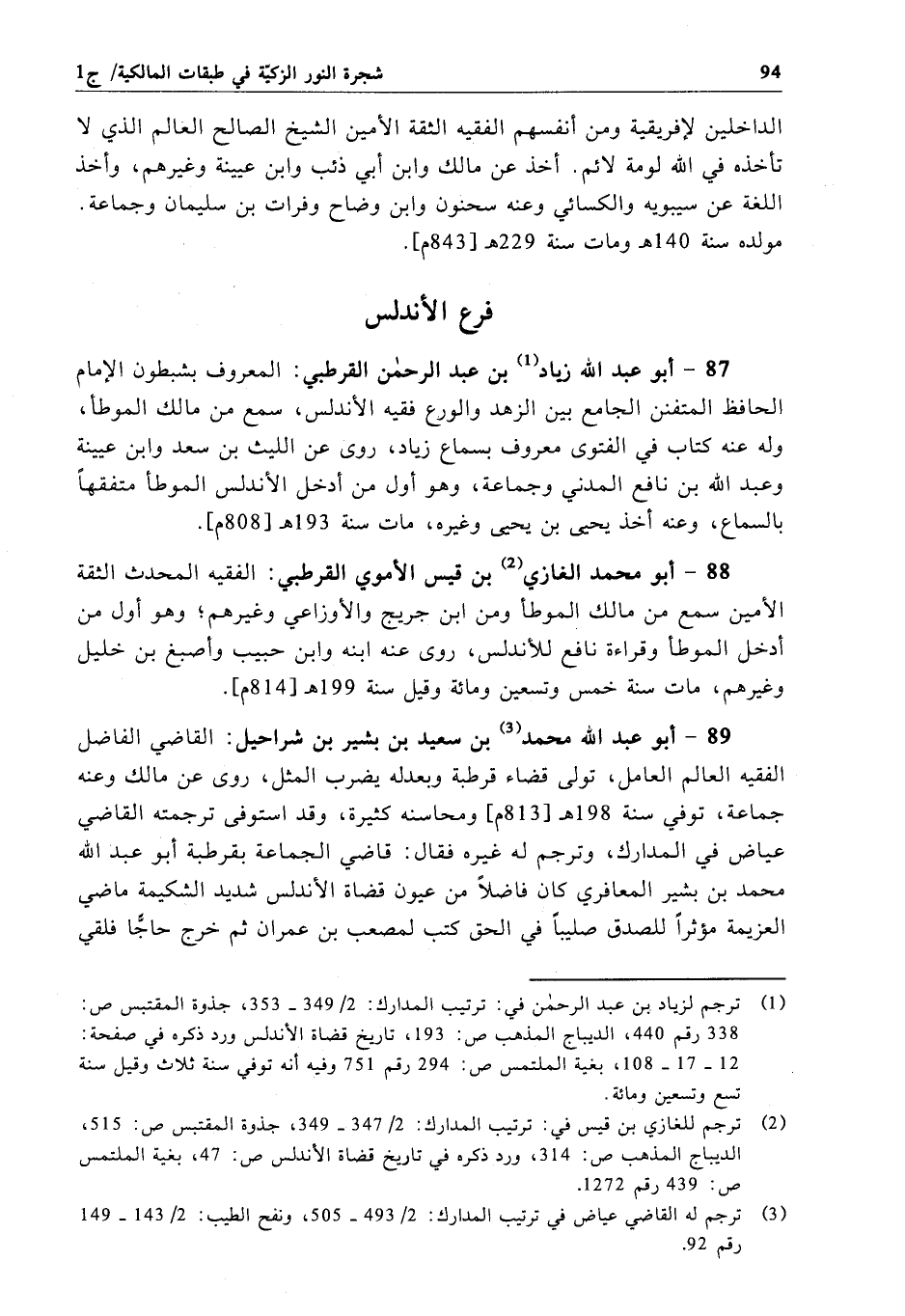 89 - أبو عبد الله محمَّد بن سعيد بن بشير بن شراحيل: القاضي الفاضل الفقيه العالم العامل، تولى قضاء قرطبة وبعدله يضرب المثل، روى عن مالك وعنه جماعة، توفي سنة 198 هـ[813 م]، ومحاسنه كثيرة، وقد استوفى ترجمته القاضي عياض في المدارك، وترجم له غيره فقال: قاضي الجماعة بقرطبة أبو عبد الله محمَّد بن بشير المعافري كان فاضلاً من عيون قضاة الأندلس شديد الشكيمة ماضي العزيمة مؤثراً للصدق صليباً في الحق كتب لمصعب بن عمران ثم خرج حاجًّا فلقي
