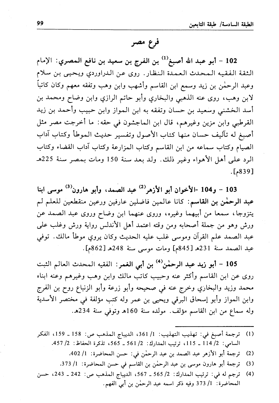 102 - أبو عبد الله أصبغ بن الفرج بن سعيد بن نافع المصري: الإمام الثقة الفقيه المحدث العمدة النظار. روى عن الدراوردي ويحيى بن سلام وعبد الرحمن بن زيد وسمع ابن القاسم وأشهب وابن وهب وتفقه معهم وكان كاتباً لابن وهب، روى عنه الذهبي والبخاري وأبو حاتم الرازي وابن وضاح ومحمد بن أسد الخشني وسعيد بن حسان وتفقه به ابن المواز وابن حبيب وأحمد بن زيد القرطبي وابن مزين وغيرهم، قال ابن الماجشون في حقه: ما أخرجت مصر مثل أصبغ له تآليف حسان منها كتاب الأصول وتفسير حديث الموطأ وكتاب آداب الصيام وكتاب سماعه من ابن القاسم وكتاب المزارعة وكتاب آداب القضاء وكتاب الرد على أهل الأهواء وغير ذلك. ولد بعد سنة 150 ومات بمصر سنة 225 هـ[839 م].