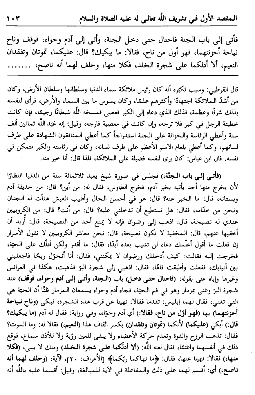 فأتى إلى باب الجنة فاحتال حتى دخل الجنة، وأتى إلى آدم وحواء، فوقف وناح نياحة أحزنتهما، فهو أول من ناح، فقالا: ما يبكيك؟ قال: عليكما، تموتان وتفقدان النعيم، ألا أدلكما على شجرة الخلد، فكلا منها، وحلف لهما أنه ناصح.........
