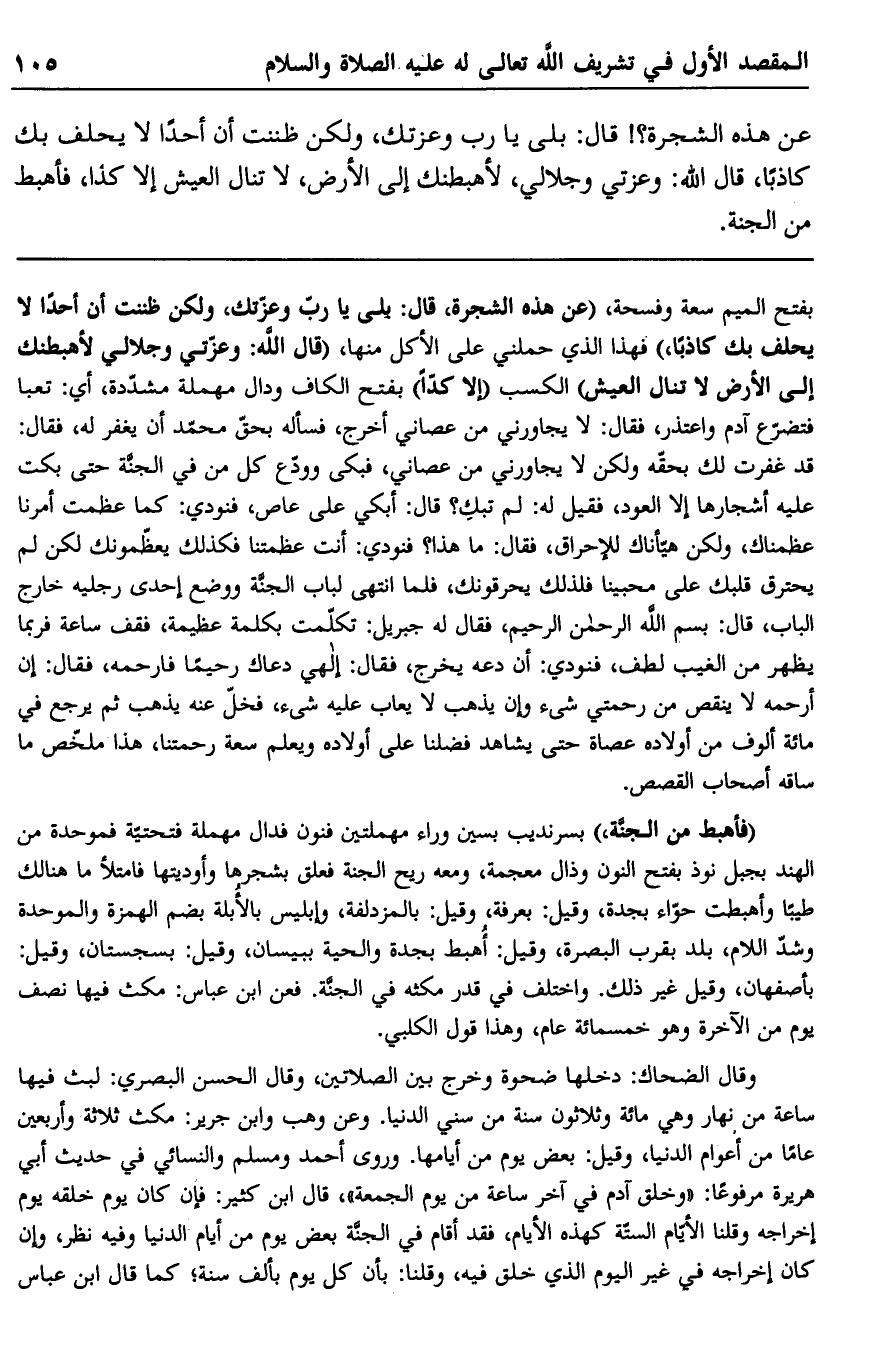 وقال الضحاك: دخلها ضحوة وخرج بين الصلاتين، وقال الحسن البصري: لبث فيها ساعة من نهار وهي مائة وثلاثون سنة من سني الدنيا. وعن وهب وابن جرير: مكث ثلاثة وأربعين عامًا من أعوام الدنيا، وقيل: بعض يوم من أيامها. وروى أحمد ومسلم والنسائي في حديث أبي هريرة مرفوعًا، "وخلق آدم في آخر ساعة من يوم الجمعة" قال ابن كثير: فإن كان يوم خلقه يوم إخراجه وقلنا الأيام الستة كهذه الأيام، فقد أقام في الجنة بعض يوم من أيام الدنيا وفيه نظر، وإن كان إخراجه في غير اليوم الذي خلق فيه، وقلنا: بأن كل يوم بألف سنة؛ كما قال ابن عباس