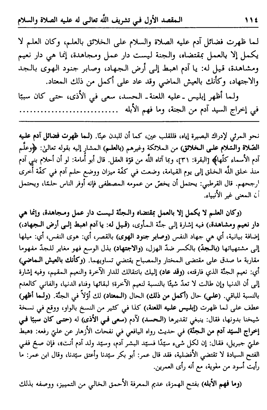 "وكان العلم لا يكمل إلا بالعمل بمقتضاه والجنة ليست دار عمل ومجاهدة، وإنما هي دار نعيم ومشاهدة" فيه إشارة إلى جنة المأوى، "قيل له: يا آدم اهبط إلى أرض الجهاد" إضافة بيانية، أي هي جهاد النفس "وصابر جنود الهوى" بالقصر، أي: هوى النفس، أي: ميلها إلى مشتهياتها "بالجد" بالكسر ضد الهزل، "والاجتهاد" بذل الوسع فهو مغاير للجد مفهومًا مقاربة ما صدق على مقتضى المختار والمصباح يقتضي تساويهما. "وكأنك بالعيش الماضي" أي: نعيم الجنة الذي فارقته، "وقد عاد" إليك بانتقالك للدار الآخرة والنعيم المقيم، وفيه إشارة إلى أن الدنيا وإن طالت لا تعد شيئًا بالنسبة لنعيم الآخرة؛ لبقائها وفناء الدنيا، والفاني كالعدم بالنسبة للباقي. "علي" حال "أكمل من ذلك" الحال "المعتاد" لك أولا في الجنة. "ولما أظهر" عطف على لما ظهرت "إبليس عليه اللعنة" كذا في كثير من النسخ بالواو، ووقع في نسخة شيخنا بدونها، فقال: ينبغي تقديرها "الحسد" لآدم "سعى في الأذى" له "حتى كان سببًا في إخراج السيد آدم من الجنة" في حديث رواه اليافعي في نفحات الأزهار عن علي رفعه: "هبط علي جبريل، فقال: إن لكل شيء سيدًا فسيد البشر آدم، وسيد ولد آدم أنت" فإن صح ففي الفتح السيادة لا تقتضي الأفضلية، فقد قال عمر: أبو بكر سيدنا وأعتق سيدنا، وقال ابن عمر: ما رأيت أسود من معاوية، مع أنه رأى العمرين.