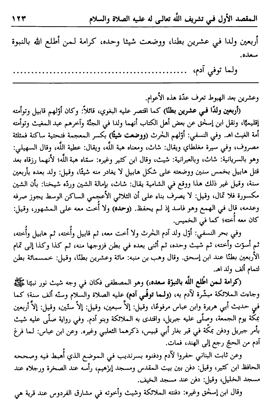 "أربعين ولدًا في عشرين بطنًا" كما اقتصر عليه البغوي، قائلا: وكان أولهم قابيل وتوأمته إقليميا، ونقل ابن إسحاق عن بعض أهل الكتاب أنهما ولدا في الجنة وآخرهم عبد المغيث وتوأمته أمة الغيث. ا. هـ. وفي النسفي: أولهم الحارث "ووضعت شيثا" بكسر المعجمة فتحتية ساكنة فمثلثة مصروف، وفي سيرة مغلطاي ويقال: شاث، ومعناه هبة الله، ويقال: عطية الله، وقال السهيلي: وهو بالسريانية: شاث، وبالعبرانية: شيث، وقال ابن كثير وغيره: سماه هبة الله؛ لأنهما رزقاه بعد قتل هابيل بخمس سنين ووضعته على شكل هابين لا يغادر منه شيئًا، وقيل: ولد بعده بأربعين سنة، وقيل غير ذلك هذا ووقع في الشامية يقال: شاث، بإمالة الشين ورده شيخنا: بأن الشين مكسورة فلا تمال، وقيل: لا يصرف بناء على أن الثلاثي الأعجمي الساكن الوسط يجوز صرفه وعدمه، قال في الهمع وهو فساد إذ لم يحفظ. "وحده" ولا أخت معه على المشهور، وقيل: كان معه أخته؛ كما في الخميس.