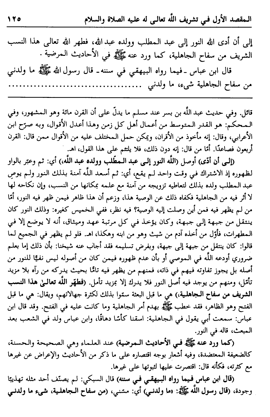 إلى أن أدى الله النور إلى عبد المطلب وولده عبد الله، فطهر الله تعالى هذا النسب الشريف من سفاح الجاهلية، كما ورد عنه صلى الله عليه وسلم في الأحاديث المرضية.