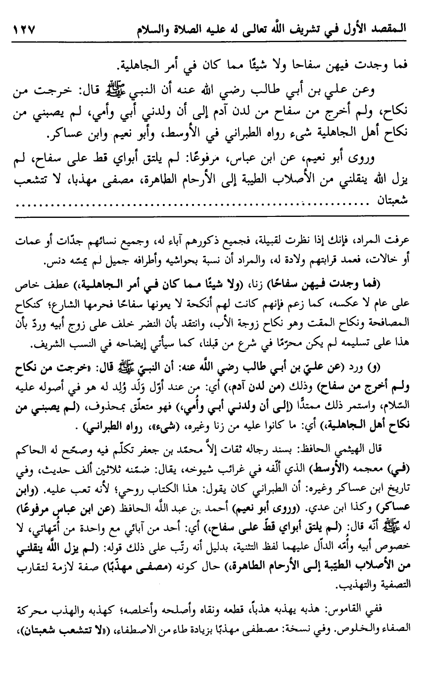 وعن علي بن أبي طالب رضي الله عنه أن النبي صلى الله عليه وسلم قال: "خرجت من نكاح، ولم أخرج من سفاح من لدن آدم إلى أن ولدني أبي وأمي، لم يصبني من نكاح أهل الجاهلية شيء". رواه الطبراني في الأوسط, وأبو نعيم وابن عساكر.