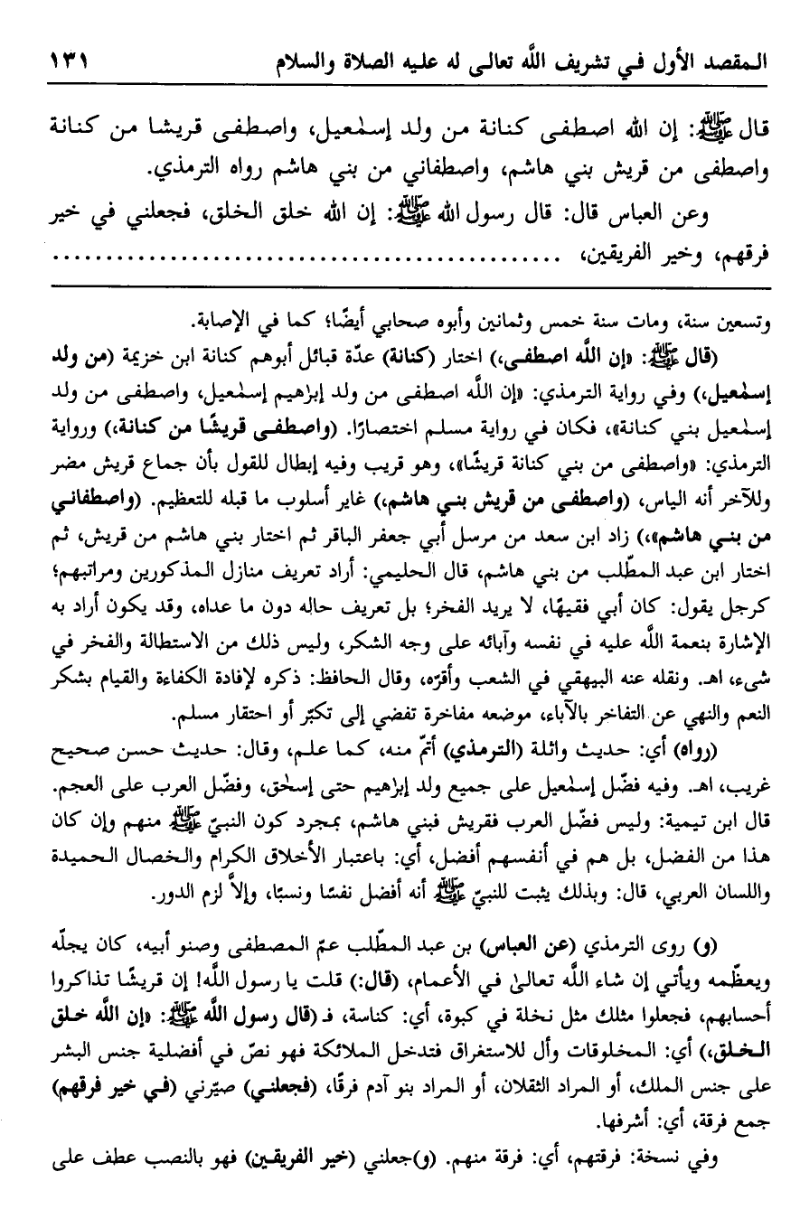 "قال صلى الله عليه وسلم: "إن الله اصطفى" اختار "كنانة" عدة قبائل أبوهم كنانة ابن خزيمة "من ولد إسماعيل" وفي رواية الترمذي: "إن الله اصطفى من ولد إبراهيم إسماعيل، واصطفى من ولد إسماعيل بني كنانة" فكان في رواية مسلم اختصارًا. "واصطفى قريشًا من كنانة" ورواية الترمذي: "واصطفى من بني كنانة قريشًا" وهو قريب وفيه إبطال للقول بأن جماع قريش مضر وللآخر أنه الياس، "واصطفى من قريش بني هاشم" غاير أسلوب ما قبله للتعظيم. "واصطفاني من بني هاشم" زاد ابن سعد من مرسل أبي جعفر الباقر ثم اختار بني هاشم من قريش، ثم اختار ابن عبد المطلب من بني هاشم، قال الحليمي: أراد تعريف منازل المذكورين ومراتبهم؛ كرجل يقول: كان أبي فقيهًا، لا يريد الفخر؛ بل تعريف حاله دون ما عداه، وقد يكون أراد به الإشارة بنعمة الله عليه في نفسه وآبائه على وجه الشكر، وليس ذلك من الاستطالة والفخر في شيء. ا. هـ. ونقله عنه البيهقي في الشعب وأقره، وقال الحافظ: ذكره لإفادة الكفاءة والقيام بشكر النعم والنهي عن التفاخر بالآباء، موضعه مفاخرة تفضي إلى تكبر أو احتقار مسلم.
