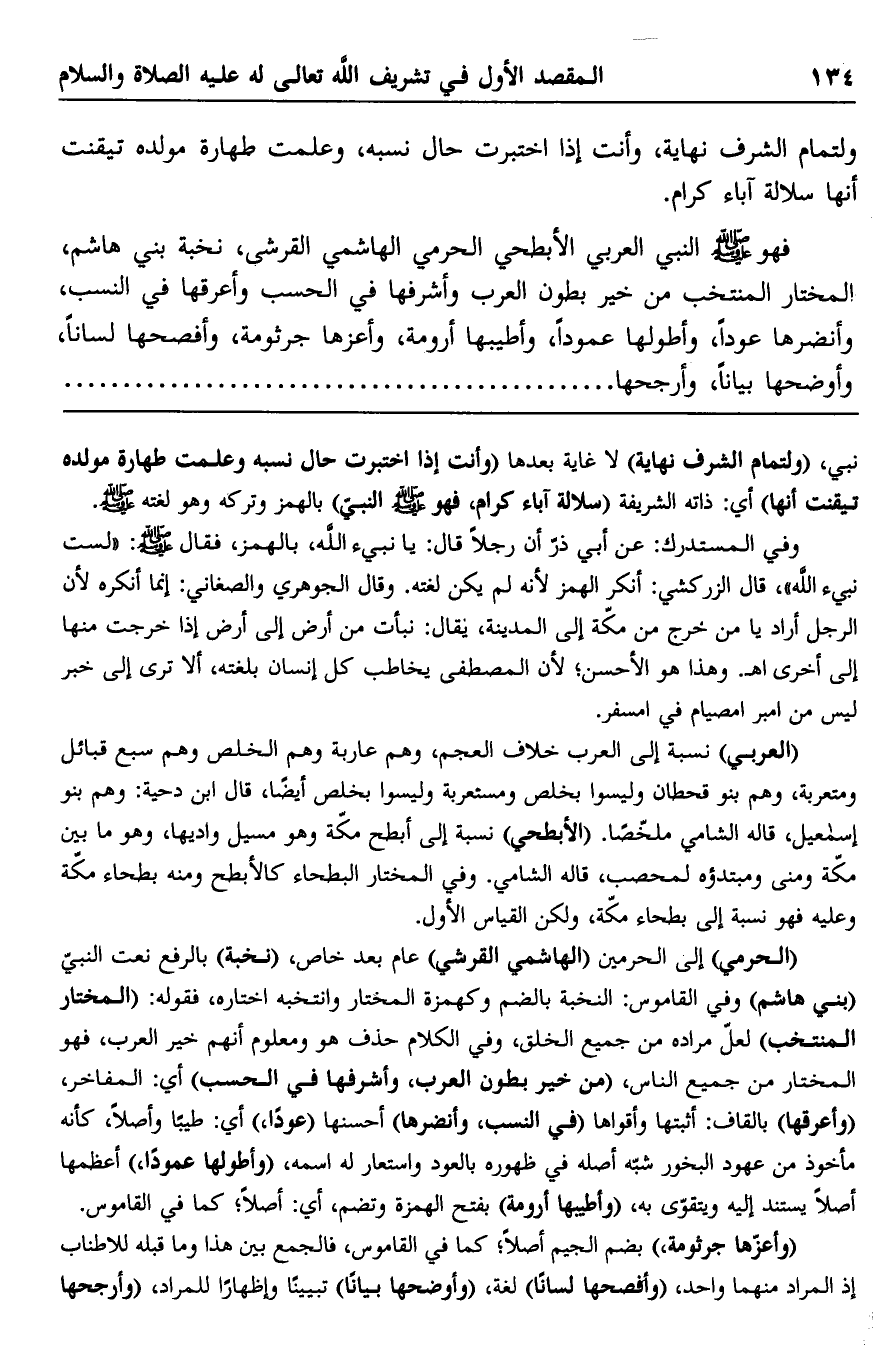 فهو صلى الله عليه وسلم النبي العربي الأبطحي الحرمي الهاشمي القرشي، نخبة بني هاشم، المختار المنتخب من خير بطون العرب وأشرفها في الحسب وأعرقها في النسب، وأنضرها عودًا، وأطولها عمودًا، وأطيبها أرومة، وأعزها جرثومة، وأفصحها لسانًا، وأوضحها بيانًا، وأرجحها..............