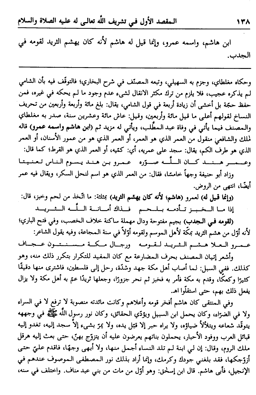 وحكاه مغلطاي، وجزم به السهيلي، وتبعه المصنف في شرح البخاري؛ فالتوقف فيه بأن الشامي لم يذكره عجيب، فلا يلزم من ترك مكثر الأنفال لشيء عدم وجود ما لم يحكه في غيره، فمن حفظ حجة بل أخشى أن زيادة أربعة في قول الشامي، يقال: بلغ مائة وأربعة وأربعين من تحريف النساخ لقولهم أعلى ما قيل مائة وأربعين، وقيل: عاش مائة وعشرين سنة، صدر به مغلطاي والمصنف فيما يأتي في وفاة عبد المطلب، ويأتي له مزيد ثم "ابن هاشم واسمه عمرو" قاله مالك والشافعي: منقول من العمر الذي هو العمر، أو العمر الذي هو من عمور الأسنان، أو العمر الذي هو طرف الكم، يقال: سجد على عمريه، أي: كميه، أو العمر الذي هو القرط؛ كما قال: