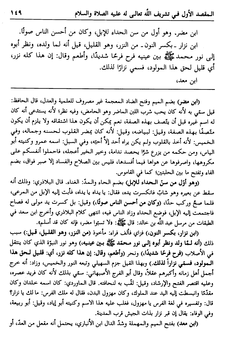 "ابن نزار، بكسر النون" فزاي فألف فراء: مأخوذ "من النزر، وهو القليل، قيل" سبب ذلك "أنه لما ولد ونظر أبوه إلى نور محمد صلى الله عليه وسلم بين عينيه" وهو نور النبوة الذي كن ينتقل في الأصلاب "فرح فرحًا شديدًا" ونحر "وأطعم، وقال: إن هذا كله نزر، أي: قليل لحق هذا المولود، فسمي نزارًا لذلك" وبهذا القيل جزم السهيلي وتبعه النور والخميس، وزاد: أنه خرج أجمل أهل زمانه وأكبرهم عقلا، وقال أبو الفرج الأصبهاني: سمي بذلك لأنه كان فريد عصره، وعليه اقتصر الفتح والإرشاد، وقيل: لقب به لنحافته. قال الماوردي: كان اسمه خلدان وكان مقدمًا وانبسطت إليه اليد عند الملوك، وكان مهزول البدن، فقال له ملك الفرس: ما لك يا نزار؟ قال: وتفسيره في لغة الفرس يا مهزول، فغلب عليه هذا الاسم وكنيته أبو إياد، وقيل: أبو ربيعة، وفي الوفاء: يقال إن قبر نزار بذات الجيش قرب المدينة.