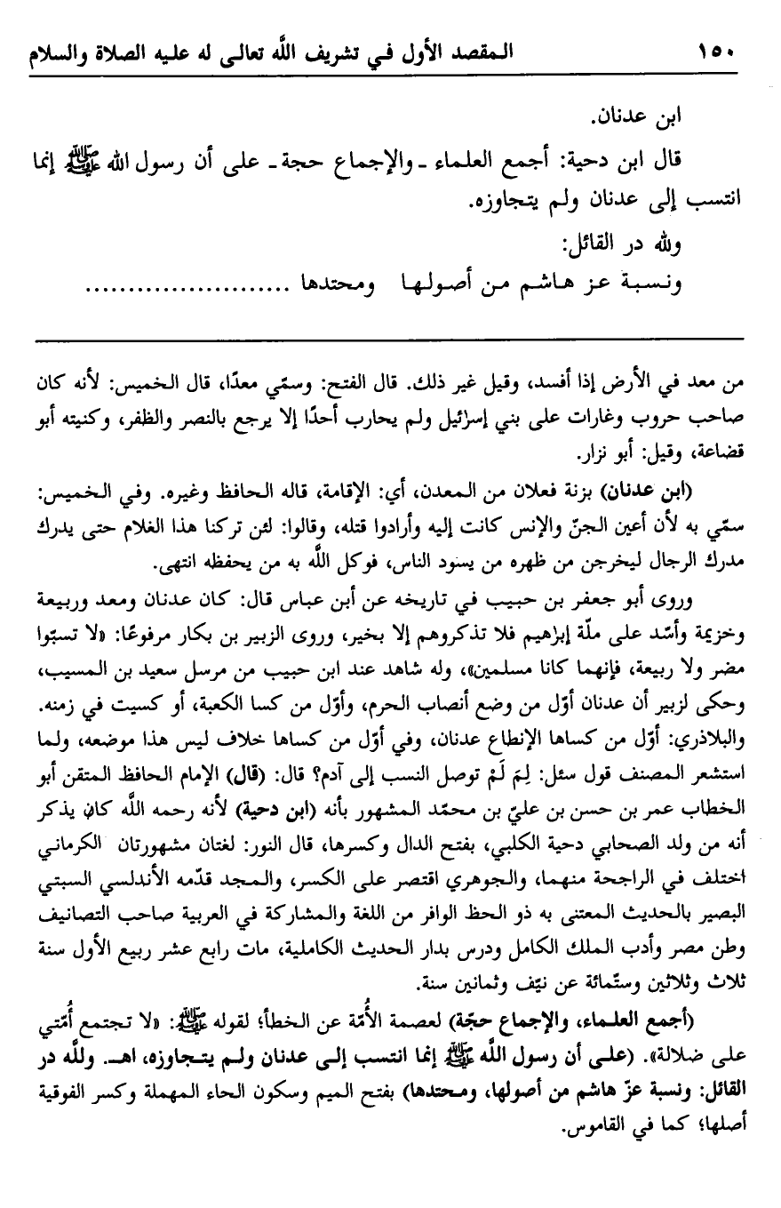 قال ابن دحية: أجمع العلماء -والإجماع حجة- على أن رسول الله صلى الله عليه وسلم إنما انتسب إلى عدنان ولم يتجاوزه.
