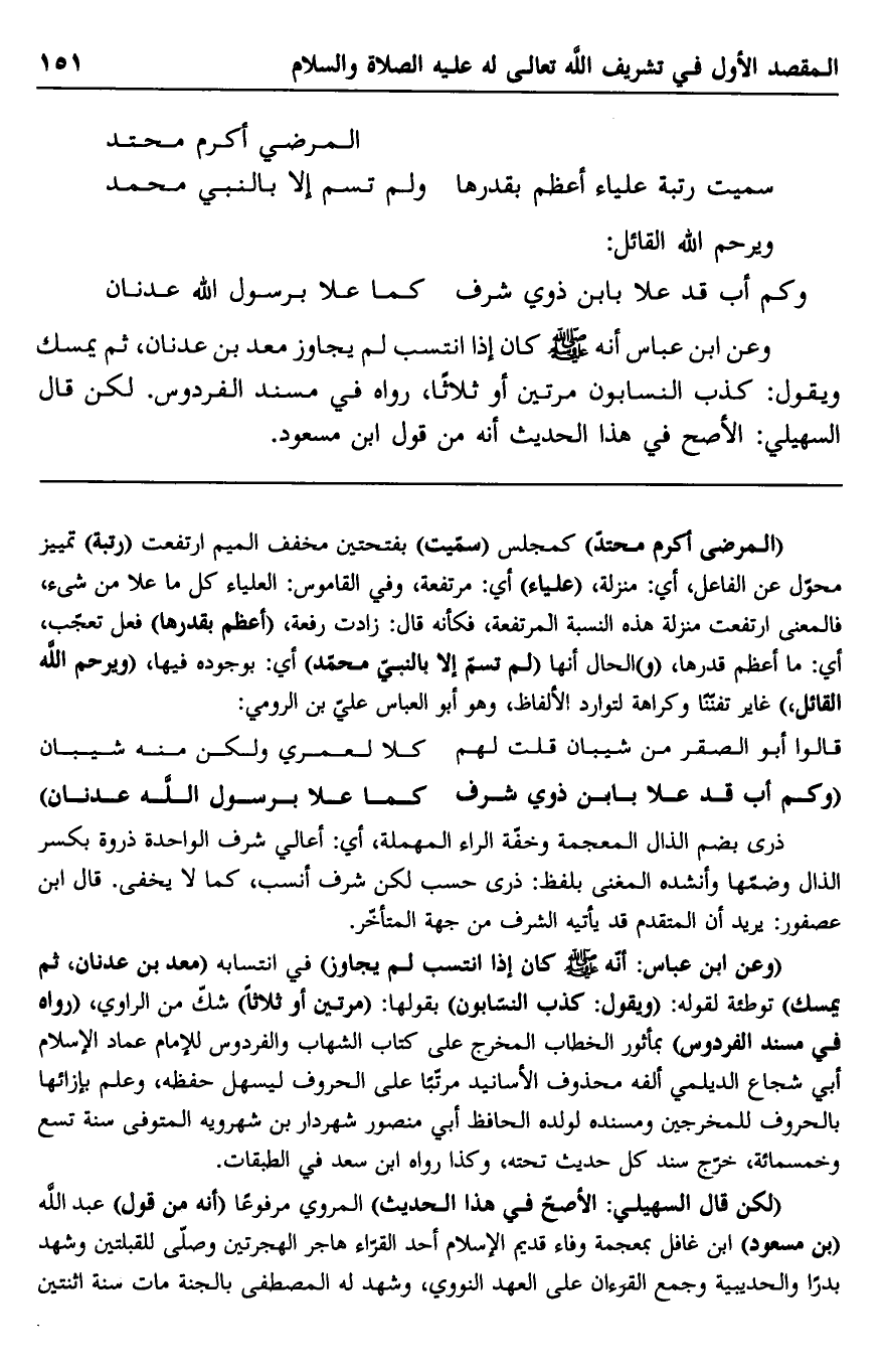 وعن ابن عباس أنه صلى الله عليه وسلم كان إذا انتسب لم يجاوز معد بن عدنان، ثم يمسك ويقول: كذب النسابون مرتين أو ثلاثًا، رواه في مسند الفردوس. لكن قال السهيلي: الأصح في هذا الحديث أنه من قول ابن مسعود.