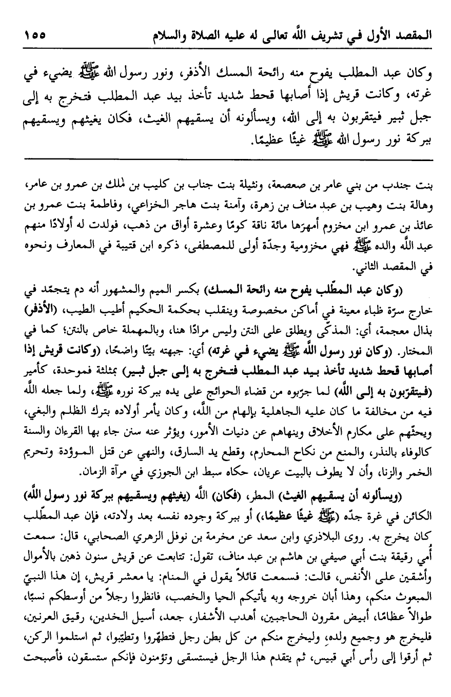 "وكان عبد المطلب يفوح منه رائحة المسك" بكسر الميم والمشهور أنه دم يتجمد في خارج سرة ظباء معينة في أماكن مخصوصة وينقلب بحكمة الحكيم أطيب الطيب، "الأذفر" بذال معجمة، أي: المذكى ويطلق على النتن وليس مرادًا هنا، وبالمهملة خاص بالنتن؛ كما في المختار. "وكان نور رسول الله صلى الله عليه وسلم يضيء في غرته" أي: جبهته بينًا واضحًا، "وكانت قريش إذا أصابها قحط شديد تأخذ بيد عبد المطلب فتخرج به إلى جبل ثبير" بمثلثة فموحدة، كأمير "فيتقربون به إلى الله" لما جربوه من قضاء الحوائج على يده ببركة نوره صلى الله عليه وسلم، ولما جعله الله فيه من مخالفة ما كان عليه الجاهلية بإلهام من الله، وكان يأمر أولاده بترك الظلم والبغي، ويحثهم على مكارم الأخلاق وينهاهم عن دنيات الأمور، ويؤثر عنه سنن جاء بها القرآن والسنة كالوفاء بالنذر، والمنع من نكاح المحارم، وقطع يد السارق، والنهي عن قتل الموءودة وتحريم الخمر والزنا، وأن لا يطوف بالبيت عريان، حكاه سبط ابن الجوزي في مرآة الزمان.