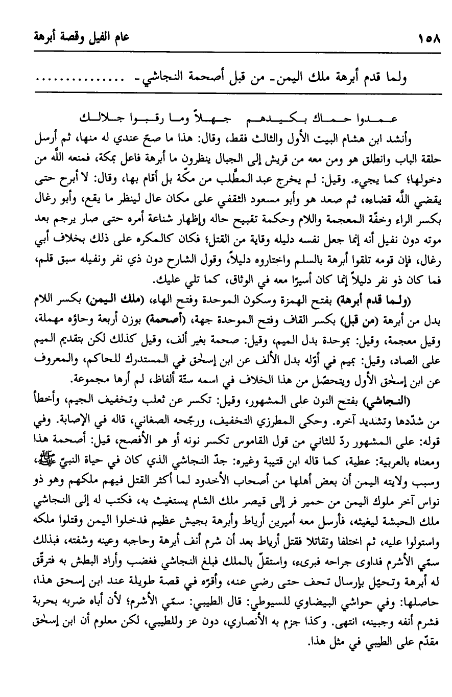 "ولما قدم أبرهة" بفتح الهمزة وسكون الموحدة وفتح الهاء، "ملك اليمن" بكسر اللام بدل من أبرهة "من قبل" بكسر القاف وفتح الموحدة جهة، "أصحمة" بوزن أربعة وحاؤه مهملة، وقيل معجمة، وقيل: بموحدة بدل الميم، وقيل: صحمة بغير ألف، وقيل كذلك لكن بتقديم الميم على الصاد، وقيل: بميم في أوله بدل الألف عن ابن إسحاق في المستدرك للحاكم، والمعروف عن ابن إسحاق الأل ويتحصل من هذا الخلاف في اسمه ستة ألفاظ، لم أرها مجموعة.