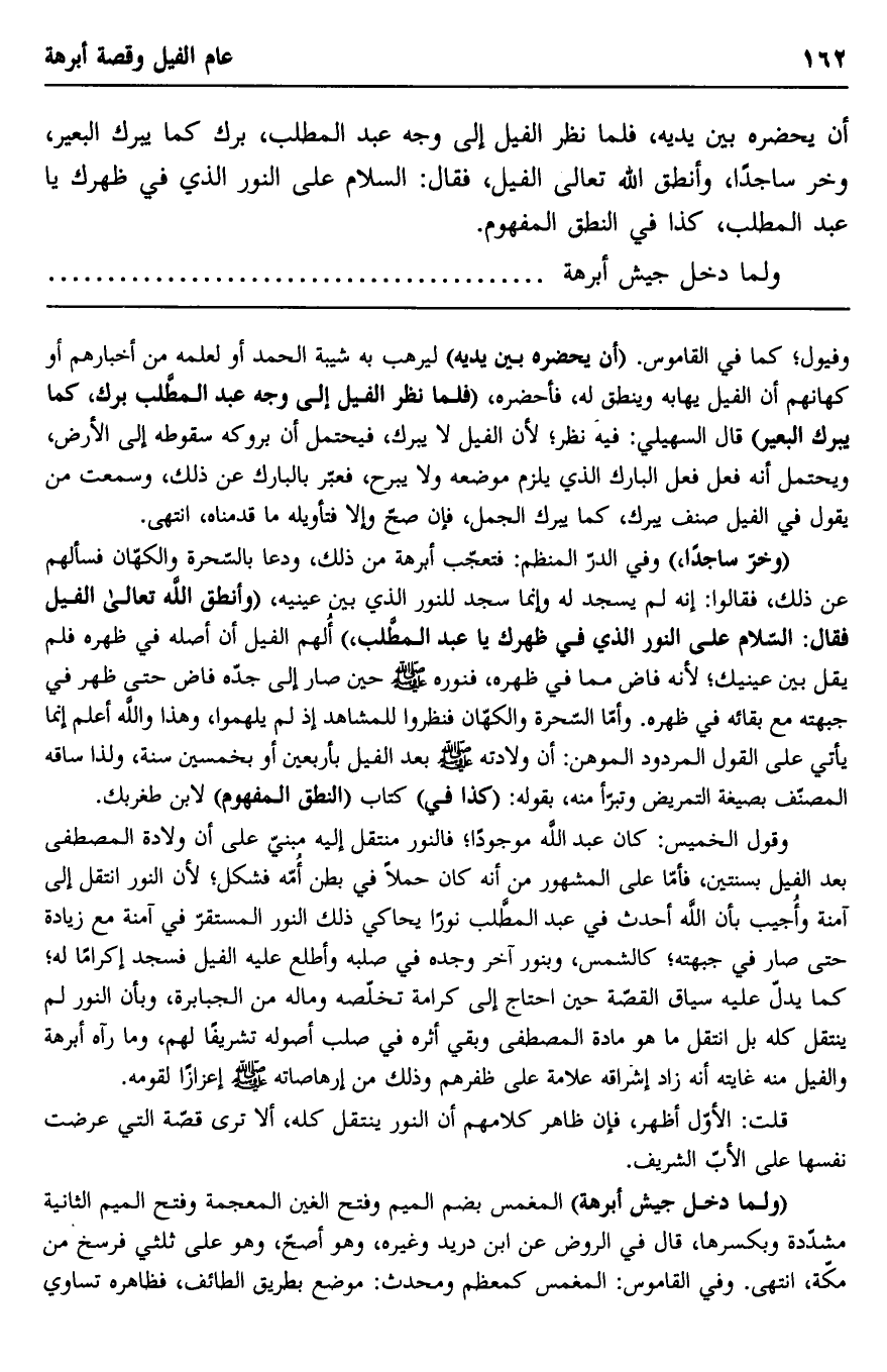 وقول الخميس: كان عبد الله موجودًا؛ فالنور منتقل إليه مبني على أن ولادة المصطفى بعد الفيل بسنتين، فأما على المشهور من أنه كان حملا في بطن أمه فشكل؛ لأن النور انتقل إلى آمنة وأجيب بأن الله أحدث في عبد المطلب نورًا يحاكي ذلك النور المستقر في آمنة مع زيادة حتى صار في جبهته؛ كالشمس، وبنور آخر وجده في صلبه وأطلع عليه الفيل فسجد إكرامًا له؛ كما يدل عليه سياق القصة حين احتاج إلى كرامة تخلصه وماله من الجبابرة، وبأن النور لم ينتقل كله بل انتقل ما هو مادة المصطفى وبقي أثره في صلب أصوله تشريفًا لهم، وما رآه أبرهة والفيل منه غايته أن زاد إشراقه علامة على ظفرهم وذلك من إرهاصته صلى الله عليه وسلم إعزازًا لقومه.