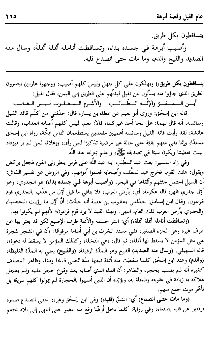 وفي زاد المسير: بعث عبد المطلب ابنه عبد الله على فرس ينظر إلى القوم فجعل يركض ويقول: هلك القوم، فخرج عبد المطلب وأصحابه فغنموا أموالهم. وفي الروض عن تفسير النقاش: أن السيل احتمل جثثهم وألقاها في البحر. "وأصيب أبرهة في جسده بداء" هو الجدري، وهو أول جدري ظهر، قاله عكرمة، أي: بأرض العرب، فلا ينافي ما قيل أول من عذب بالجدري قوم فرعون، وقال ابن إسحاق: حدثني يعقوب بن عتبة أنه حدث: أن أول ما رؤيت الحصباء والجدري بأرض العرب ذلك العام، انتهى. وبهذا القيد لا يرد قوم فرعون؛ لأنهم لم يكونوا بها.