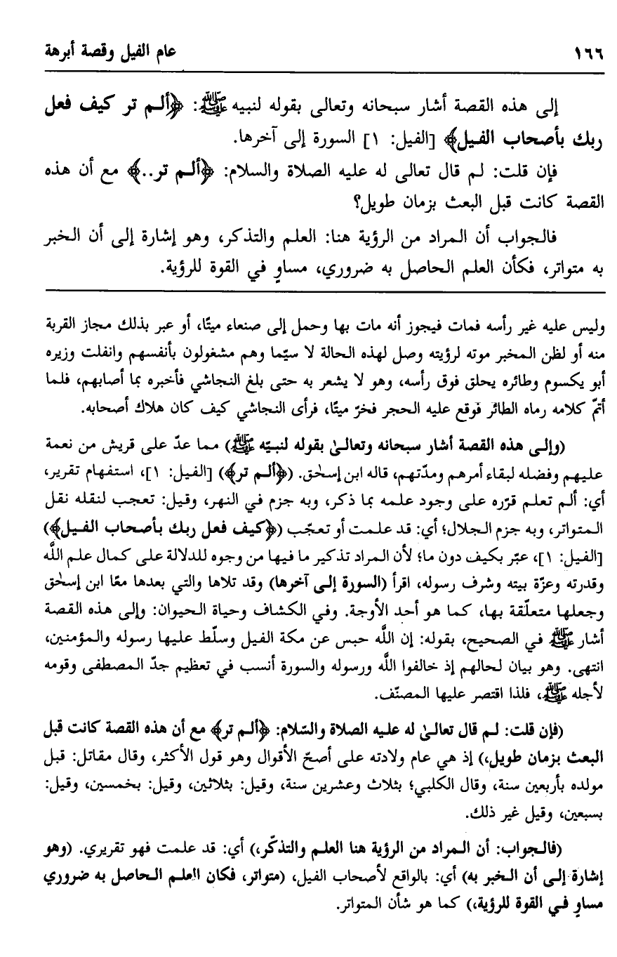 "فإن قلت: لم قال تعالى له عليه الصلاة والسلام: {أَلَمْ تَرَ} مع أن هذه القصة كانت قبل البعث بزمان طويل" إذ هي عام ولادته على أصح الأقوال وهو قول الأكثر، وقال مقاتل: قبل مولده بأربعين سنة، وقال الكلبي؛ بثلاث وعشرين سنة، وقيل: بثلاثين، وقيل: بخمسين، وقيل: بسبعين، وقيل غير ذلك.