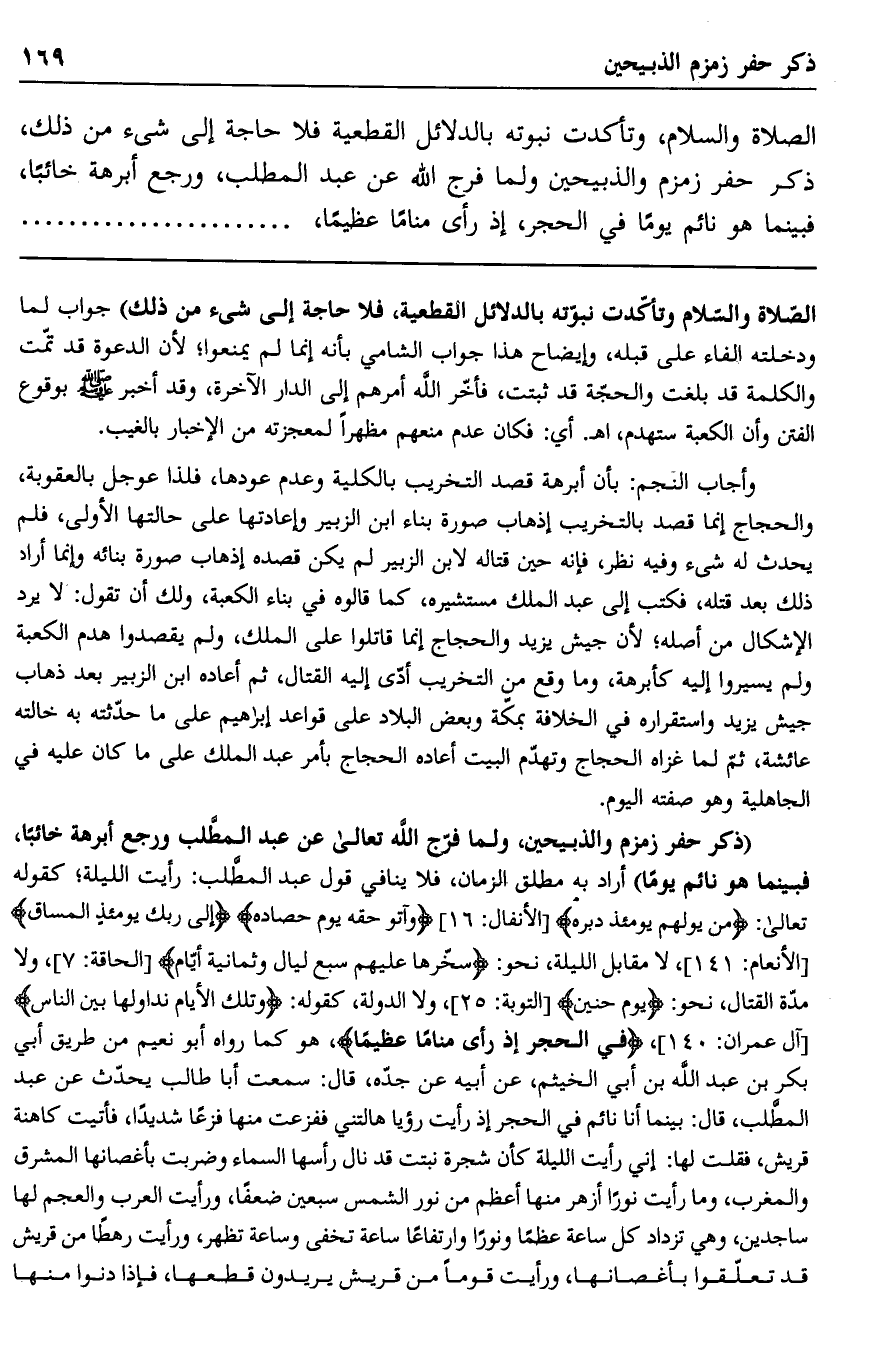 الصلاة والسلام، وتأكدت نبوته بالدلائل القطعية فلا حاجة إلى شيء من ذلك، ذكر حفر زمزم والذبيحين ولما فرج الله عن عبد المطلب، ورجع أبرهة خائبًا، فبينما هو نائم يومًا في الحجر، إذ رأى منامًا عظيمًا......................
