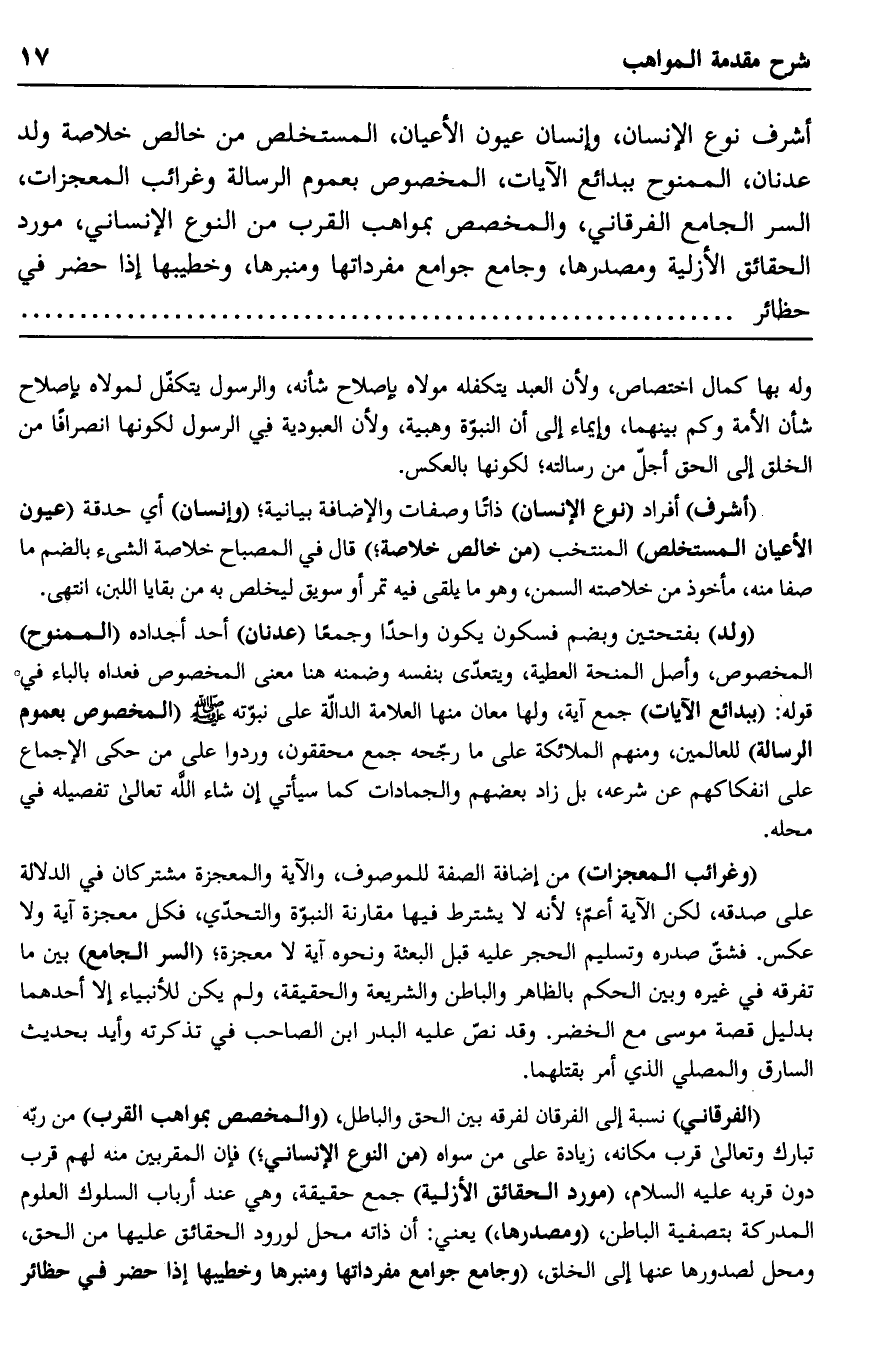 أشرف نوع الإنسان، وإنسان عيون الأعيان، المستخلص من خالص خلاصة ولد عدنان، الممنوح ببدائع الآيات، والمخصوص بعموم الرسالة وغرائب المعجزات، السر الجامع الفرقاني، والمخصص بمواهب القرب من النوع الإنساني، مورد الحقائق الأزلية ومصدرها، وجامع جوامع مفرداتها ومنبرها، وخطيبها إذا حضر في حظائر......................
