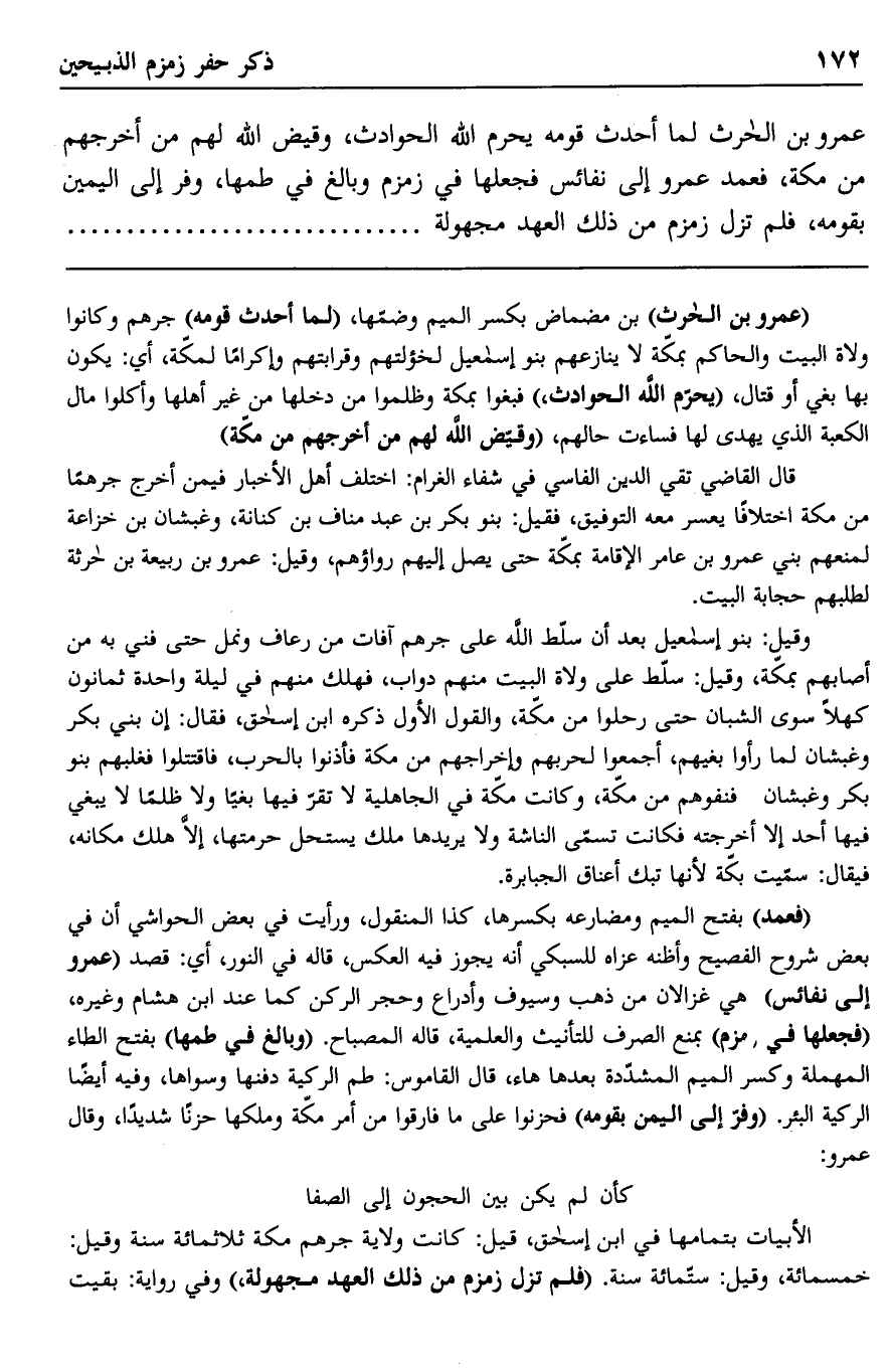 عمرو بن الحارث لما أحدث قومه بحرم الله الحوادث، وقيض الله لهم من أخرجهم من مكة، فعمد عمرو إلى نفائس فجعلها في زمزم وبالغ في طمها، وفر إلى اليمن بقومه، فلم تزل زمزم من ذلك العهد مجهولة.........................