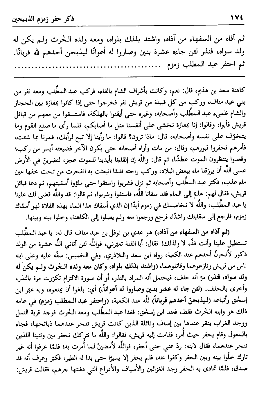 ثم آذاه من السفهاء من آذاه، واشتد بذلك بلواه، ومعه ولده الحارث ولم يكن له ولد سواه، فنذر لئن جاءه عشرة بنين وصاروا له أعوانًا ليذبحن أحدهم لله قربانًا. ثم احتفر عبد المطلب زمزم........................