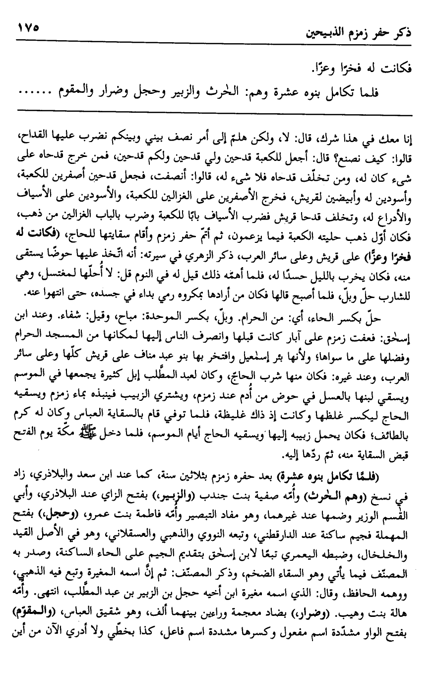 إنا معك في هذا شرك، قال: لا، ولكن هلم إلى أمر نصف بيني وبينكم نضرب عليها القداح، قالوا: كيف نصنع؟ قال: أجعل للكعبة قدحين ولي قدحين ولكم قدحين، فمن خرج قدحاه على شيء كان له, ومن تخلف قدحاه فلا شيء له، قالوا: أنصفت، فجعل قدحين أصفرين للكعبة، وأسودين له وأبيضين لقريش، فخرج الأصفران على الغزالين للكعبة، والأسودين على الأسياف والأدراع له، وتخلف قدحًا قريش فضرب الأسياف بابًا للكعبة وضرب بالباب الغزالين من ذهب، فكان أول ذهب حليته الكعبة فيما يزعمون، ثم أتم حفر زمزم وأقام سقايتها للحاج، "فكانت له فخرًا وعزًا" على قريش وعلى سائر العرب، ذكر الزهري في سيرته: أنه اتخذ عليها حوضًا يستقي منه، فكان يخرب بالليل حسدًا له، فلما أهمه ذلك قيل له في النوم قل: لا أحلها لمغتسل، وهي للشارب حل وبل، فلما أصبح قالها فكان من أرادها بمكروه رمي بداء في جسده، حتى انتهوا عنه.