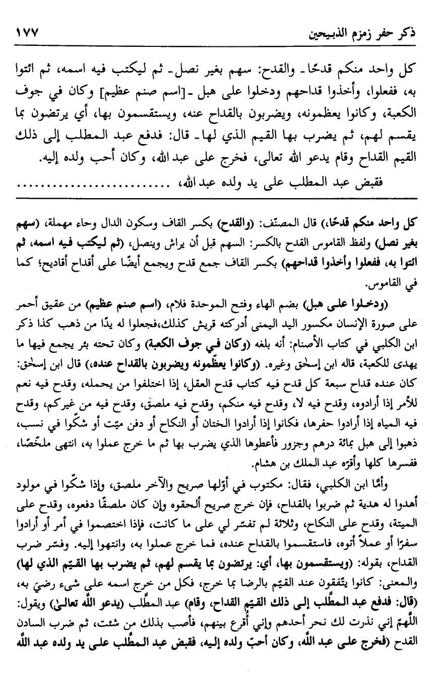وأما ابن الكلبي، فقال: مكتوب في أولها صريح والآخر ملصق، وإذا شكوا في مولود أدوا له هدية ثم ضربوا بالقداح، فإن خرج صريح الحقوه وإن كان ملصقًا دفعوه، وقدح على الميتة، وقدح على النكاح، وثلاثة لم تفسر لي على ما كانت، فإذا اختصموا في أمر أو أرادوا سفرًا أو عملا، أتوه، فاستقسموا بالقداح عنده، فما خرج عملوا به، وانتهوا إليه. وفسر ضرب القداح بقوله: "ويستقسمون بها، أي: يرتضون بما يقسم لهم، ثم يضرب بها القيم الذي لها" والمعنى: كانوا يتفقون عند القيم بالرضا بما خرج، فكل من خرج اسمه على شيء رضي به، "قال: فدفع عبد المطلب إلى ذلك القيم القداح، وقام" عبد المطلب "يدعو الله تعالى" ويقول: اللهم إني نذرت لك نحر أحدهم وإني أقرع بينهم، فأصب بذلك من شئت، ثم ضرب السادن القدح "فخرج على عبد الله، وكان أحب ولده إليه، فقبض عبد المطلب على يد ولده عبد الله