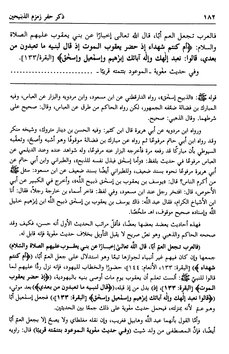 قوله صلى الله عليه وسلم: "الذبيح إسحاق" رواه الدارقطني عن ابن مسعود وابن مردويه والبزار عن العباس، وفيه المبارك بن فضالة ضعفه الجمهور، لكن رواه الحاكم من طرق عن العباس، وقال: صحيح علي شرطهما. وقال الذهبي: صحيح.