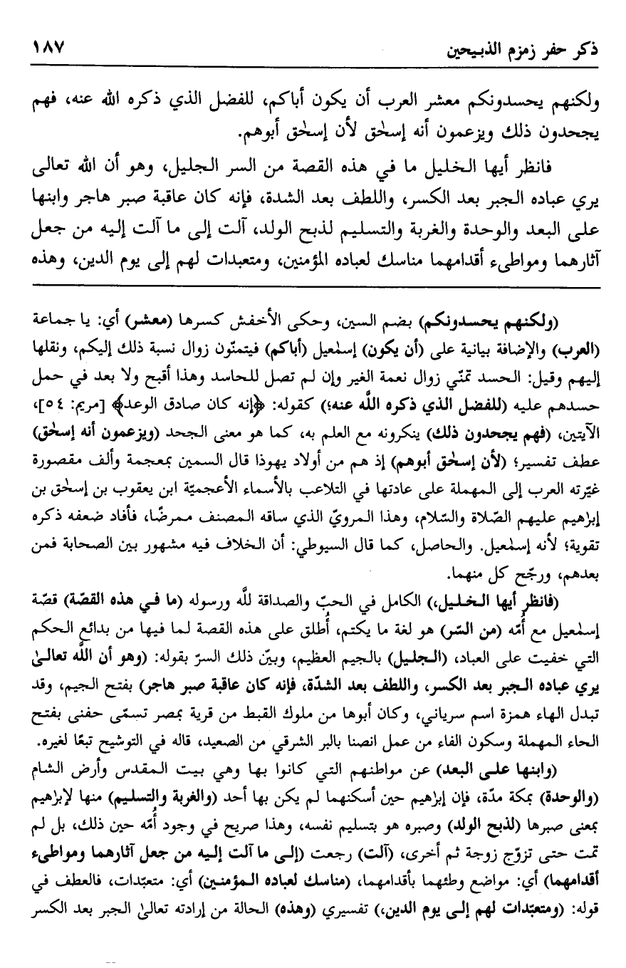 "وابنها على البعد" عن مواطنهم التي كانوا بها وهي بيت المقدس وأرض الشام و"الوحدة" بمكة مدة, فإن إبراهيم حين أسكنهما لم يكن بها أحد "والغربة والتسليم" منها لإبراهيم بمعنى صبرها "لذبح الولد" وصبره هو بتسليم نفسه، وهذا صريح في وجود أمه حين ذلك، بل لم تمت حتى تزوج زوجة ثم أخرى، "آلت" رجعت "إلى ما آلت إليه من جعل آثارهما ومواطئ أقدامهما" أي: مواضع وطئهما بأقدامهما، "مناسك لعباده المؤمنين" أي: متعبدات، فالعطف في قوله: "ومتعبدات لهم إلى يوم الدين" تفسيري "وهذه" الحالة من إرادته تعالى الجبر بعد الكسر