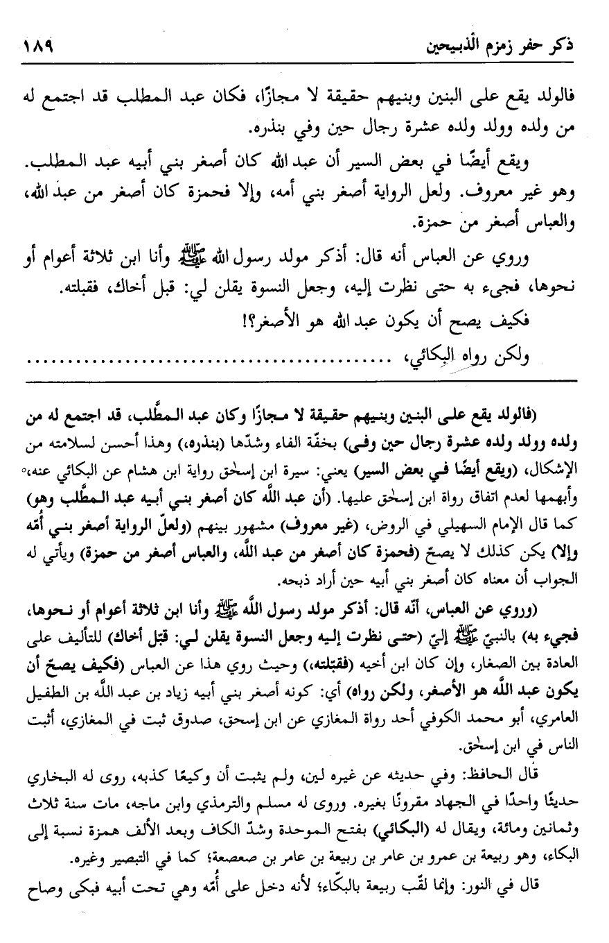 "فالولد يقع على البنين وبنيهم حقيقة لا مجازًا وكان عبد المطلب، قد اجتمع له من ولده وولد ولده عشرة رجال حين وفى" بخفة الفاء وشدها "بنذره" وهذا أحسن لسلامته من الإشكال، "ويقع أيضًا في بعض السير" يعني: سيرة ابن إسحاق رواية ابن هشام عن البكائي عنه، وأبهمها لعدم اتفاق رواة ابن إسحاق عليها. "أن عبد الله كان أصغر بني أبيه عبد المطلب وهو" كما قال الإمام السهيلي في الروض، "غير معروف" مشهور بينهم "ولعل الرواية أصغر بني أمه وإلا" يكن كذلك لا يصح "فحمزة كان أصغر من عبد الله، والعباس أصغر من حمزة" ويأتي له الجواب أن معناه كان أصغر بني أبيه حين أراد ذبحه.