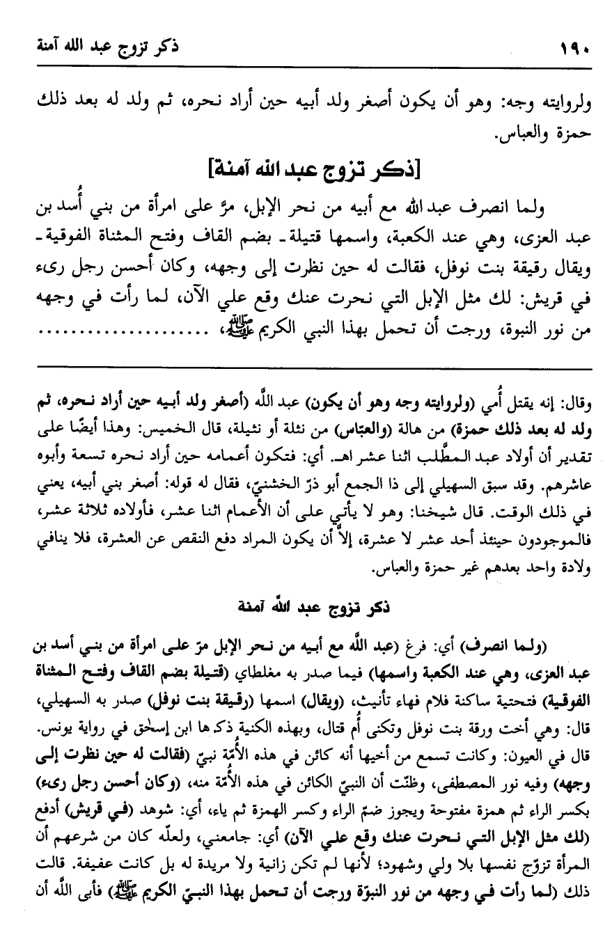 ولما انصرف عبد الله مع أبيه من نحر الإبل، مر على امرأة من بني أسد بن عبد العزى، وهي عند الكعبة، واسمها قتيلة -بضم القاف وفتح المثناة الفوقية- ويقال رقيقة بنت نوفل، فقالت له حين نظرت إلى وجهه، وكان أحسن رجل رئي في قريش: لك مثل الإبل التي نحرت عنك وقع عليّ الآن، لما رأت في وجهه من نور النبوة، ورجت أن تحمل بهذا النبي الكريم صلى الله عليه وسلم.............................