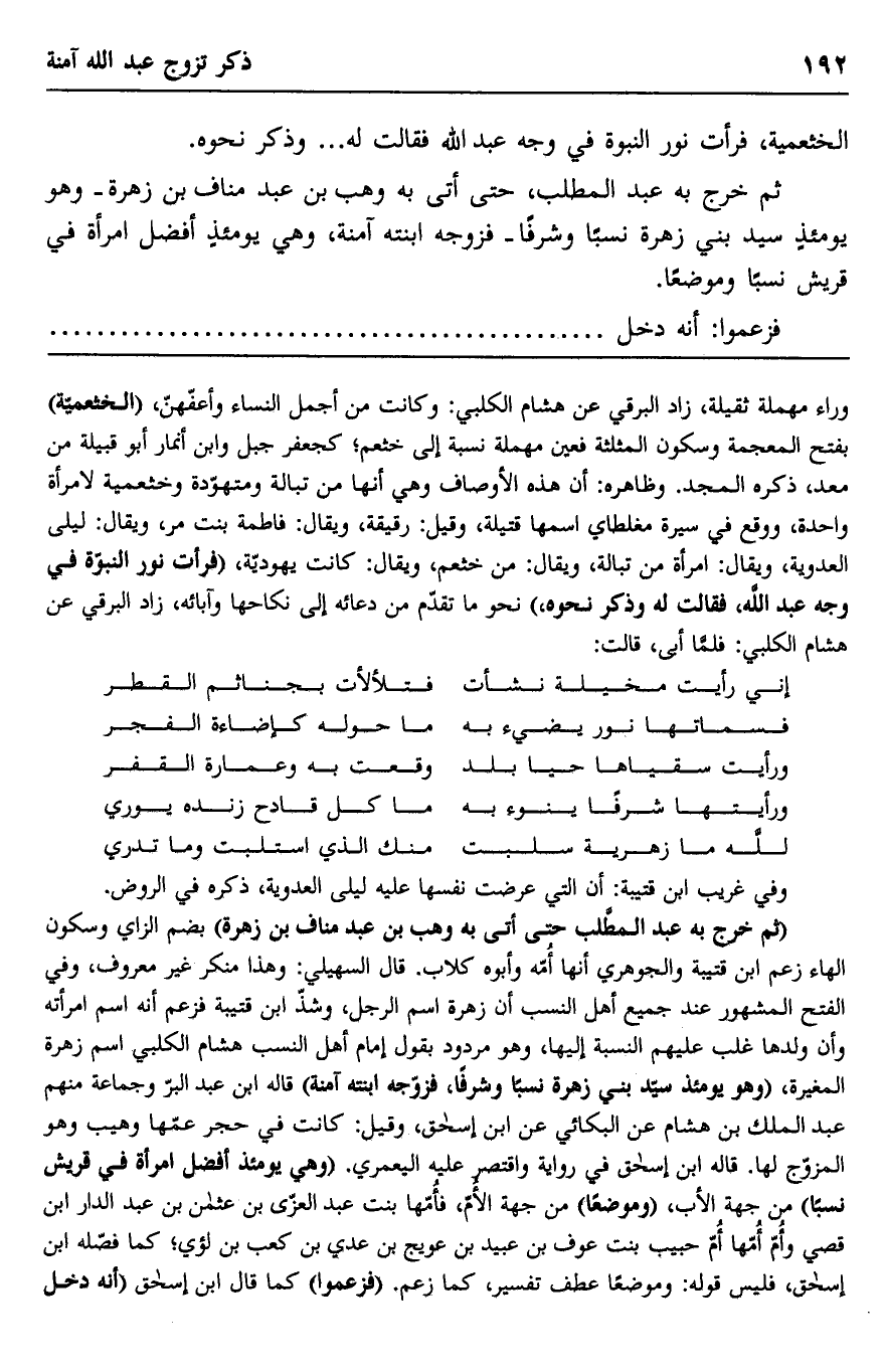 وراء مهملة ثقيلة، زاد البرقي عن هشام الكلبي: وكانت من أجمل النساء وأعفهن "الخثعمية" بفتح المعجمة وسكون المثلثة فعين مهملة نسبة إلى خثعم؛ كجعفر جبل وابن أنمار أبو قبيلة من معد، ذكره المجد. وظاهره: أن هذه الأوصاف وهي أنها من تبالة ومتهودة وخثعمية لامرأة واحدة، ووقع في سيرة مغلطاي اسمها قتيلة، وقيل: رقيقة، ويقال: فاطمة بنت مر، ويقال: ليلى العدوية، ويقال: امرأة من تبالة، ويقال: من خثعم، ويقال: كانت يهودية، "فرأت نور النبوة في وجه عبد الله، فقالت له وذكر نحوه" نحو ما تقدم من دعائه إلى نكاحها وإبائه، زاد البرقي عن هشام الكلبي: فلما أبى، قالت: