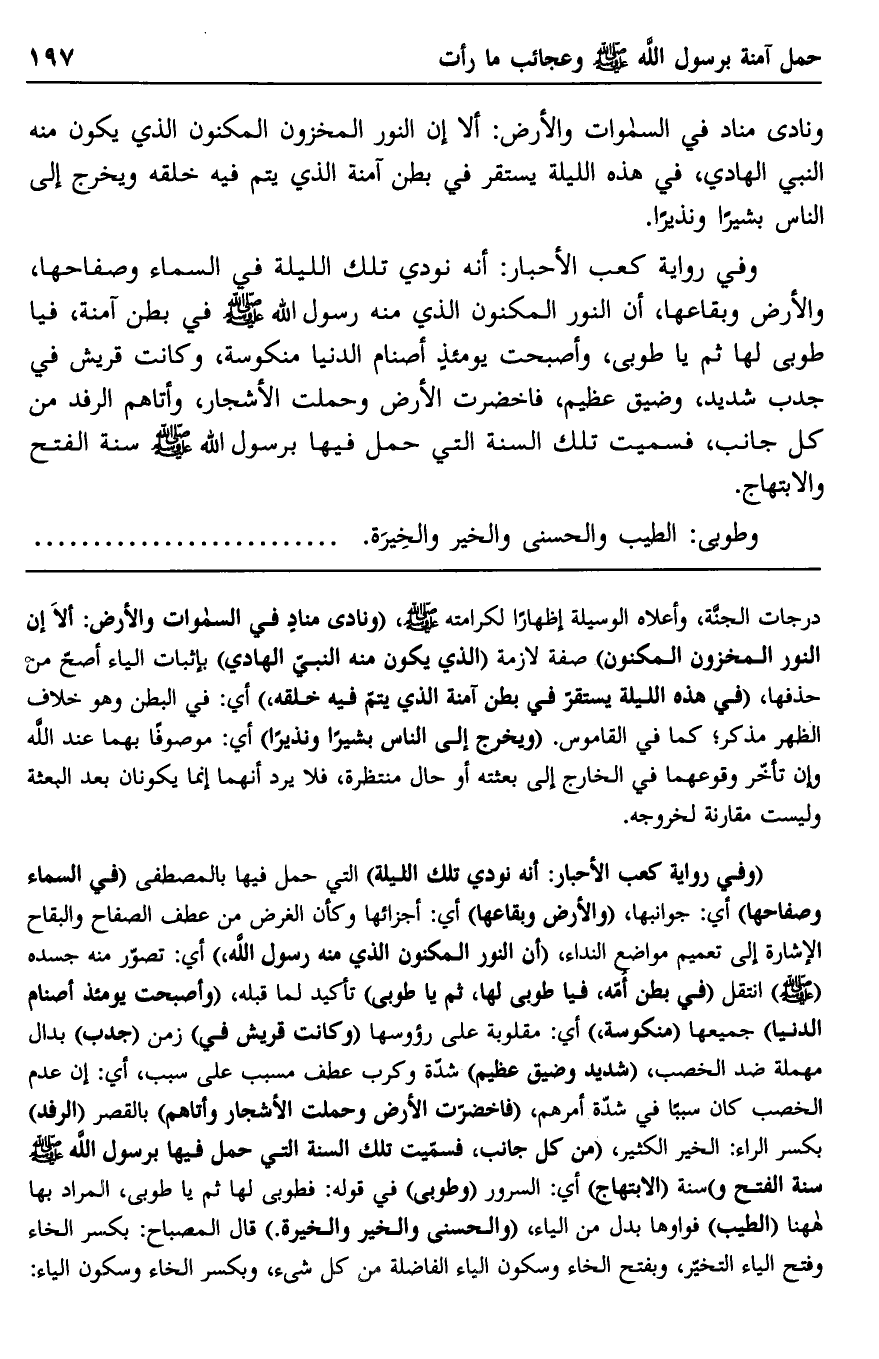 "وفي رواية كعب الأحبار: أنه نودي تلك الليلة" التي حمل فيها بالمصطفى "في السماء وصفاحها" أي: جوانبها، "والأرض وبقاعها" أي: أجزائها وكأن الغرض من عطف الصفاح والبقاح الإشارة إلى تعميم مواضع النداء، "أن النور المكنون الذي منه رسول الله"، أي: تصور منه جسده "صلى الله عليه وسلم" انتقل "في بطن أمه، فيا طوبى لها، ثم يا طوبى" تأكيد لما قبله، "وأصبحت يومئذ أصنام الدنيا" جميعها "منكوسة" أي: مقلوبة على رءوسها "وكانت قريش في" زمن "جدب" بدال مهملة ضد الخصب، "شديد وضيق عظيم" شدة وكرب عطف مسبب على سبب، أي: إن عدم الخصب كان سببًا في شدة أمرهم، "فاخضرت الأرض وحملت الأشجار وأتاهم" بالقر "الرفد" بكسر الراء: الخير الكثير، "من كل جانب، فسميت تلك السنة التي حمل فيها برسول الله صلى الله عليه وسلم سنة الفتح" وسنة "الابتهاج" أي: السرور "وطوبى" في قوله: فطوبى لها ثم يا طوبى، المراد بها هاهنا "الطيب" فواوها بدل من الياء، "والحسنى والخير والخيرة" قال المصباح: بكسر الخاء وفتح الياء التخير، وبفتح الخاء وسكون الياء الفاضلة من كل شيء، وبكسر الخاء وسكون الياء: