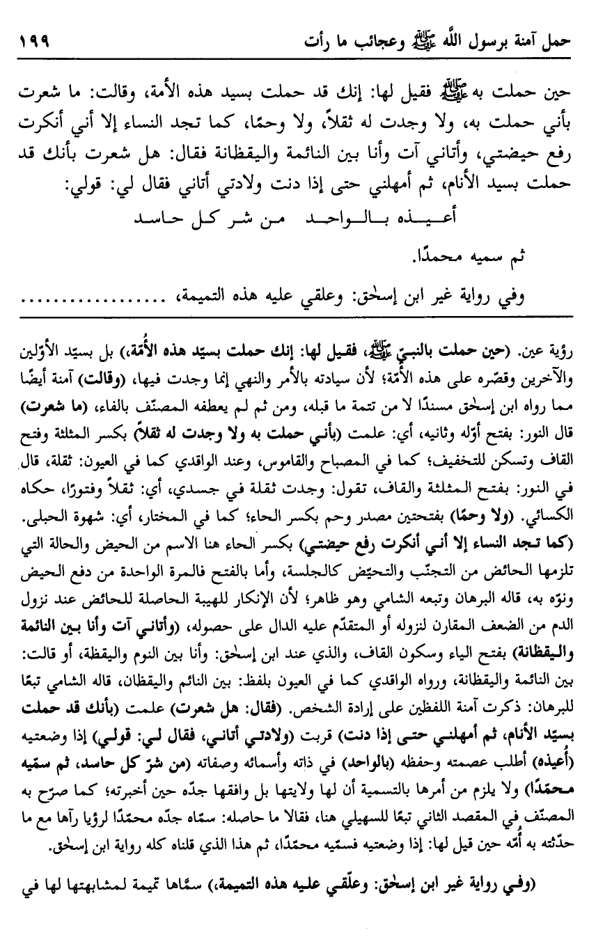 رؤية عين. "حين حملت بالنبي صلى الله عليه وسلم، فقيل لها: إنك حملت بسيد هذه الأمة" بل بسيد الأولين والآخرين وقصره على هذه الأمة؛ لأن سيادته بالأمر والنهي إنما وجدت فيها، "وقالت" آمنة أيضًا مما رواه ابن إسحاق مسندًا لا من تتمة ما قبله، ومن ثم لم يعطفه المصنف بالفاء، "ما شعرت" قال النور: بفتح أوله وثانيه، أي: علمت "بأني حملت به ولا وجدت له ثقلا" بكسر المثلثة وفتح القاف وتسكن للتخفيف؛ كما في المصباح والقاموس، وعند الواقدي كما في العيون: ثقلة، قال في النور: بفتح المثلثة والقاف، تقول: وجدت ثقلة في جسدي: أي: ثقلا وفتورًا، حكاه الكسائي. "ولا وحمًا" بفتحتين مصدر وحم بسكر الحاء؛ كما في المختار، أي: شهوة الحبلى. "كما تجد النساء إلا أني أنكرت رفع حيضتي" بكسر الحاء هنا الاسم من الحيض والحالة التي تلزمها الحائض من التجنب والتحيض كالجلسة، وأما بالفتح فالمرة الواحدة من دفع الحيض ونوه به، قاله البرهان وتبعه الشامي وهو ظاهر؛ لأن الإنكار للهيبة الحاصلة للحائض عند نزول الدم من الضعف المقارن لنزوله أو المتقدم عليه الدال على حصوله، "وأتاني آت وأنا بين النائمة واليقظانة" بفتح الياء وسكون القاف، والذي عند ابن إسحاق: وأنا بين النوم واليقظة، أو قالت: بين النائمة واليقظانة، ورواه الواقدي كما في العيون بلفظ: بين النائم واليقظان، قاله الشامي تبعًا للبرهان: ذكرت آمنة اللفظين على إرادة الشخص. "فقال: هل شعرت" علمت "بأنك قد حملت بسيد الأنام، ثم أمهلني حتى إذا دنت" قربت "ولادتي أتاني، فقال لي: قولي" إذا وضعتيه "أعيذه" أطلب عصمته وحفظه "بالواحد" في ذاته وأسمائه وصفاته "من شر كل حاسد، ثم سميه محمدًا" ولا يلزم من أمرها بالتسمية أن لها ولايتها بل وافقها جده حين أخبرته؛ كما صرح به المصنف في المقصد الثاني تبعًا للسهيلي هنا، فقال ما حاصله: سماه جده محمدًا لرؤيا رآها مع ما حدثته به أمه حين قيل لها: إذا وضعتيه فسميه محمدًا، ثم هذا الذي قلناه كله رواية ابن إسحاق.
