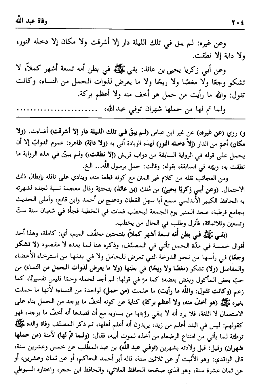 وعن أبي زكريا يحيى بن عائذ: بقي صلى الله عليه وسلم في بطن أمه تسعة أشهر كملا، لا تشكو وجعًا ولا مغصًا ولا ريحًا ولا ما يعرض لذوات الحمل من النساء، وكانت تقول: والله ما رأيت من حمل هو أخف منه ولا أعظم بركة.