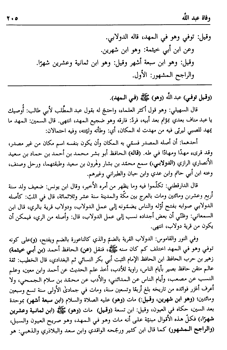 وفي النور والقاموس: الدولاب القرية بالضم والذي كالناعورة بالضم ويفتح، "و" على كونه توفي وهو في المهد اختلف كم كان سنه صلى الله عليه وسلم، فنقل "عن" الحافظ أحمد "بن أبي خيثمة" زهير بن حرب الحافظ ابن الحافظ الإمام الثابت أبي بكر النسائي ثم البغدادي، قال الخطيب: ثقة عالم متقن حافظ بصير بأيام الناس، راوية للأدب، أخذ علم الحديث عن أحمد وابن معين، وعلم النسب عن مصعب، وأيام الناس عن المدائني، والأدب عن محمد بن سلام الجمحي، ولا أعرف أغزر فوائد من تاريخه بلغ أربعًا وتسعين سنة، ومات في جمادى الأولى ستة تسع وسبعين ومائتين؛ "وهو ابن شهرين، وقيل" مات "وهو" عليه الصلاة والسلام "ابن سبعة أشه" بموحدة بعد السين، حكاه في العيون، وقيل: ابن تسعة "وقيل" مات "وهو" صلى الله عليه وسلم "ابن ثمانية وعشرين شهرًا" فكل هذه الأقوال مبنية على أنه مات وهو في المهد، وهو صريح العيون والسبل، "والراجح المشهور" كما قال ابن كثير ورجحه الواقدي وابن سعد والبلاذري والذهبي: هو