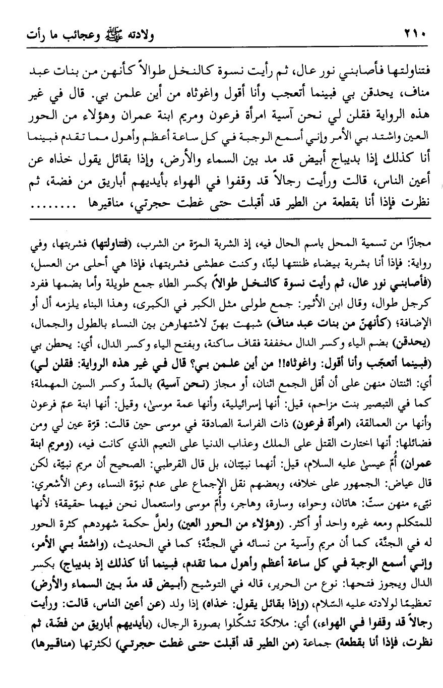 مجازًا من تسمية المحل باسم الحال فيه، إذ الشربة المرة من الشرب، "فتناولتها" فشربتها، وفي رواية: فإذا أنا بشربة بيضاء ظننتها لبنًا، وكنت عطشى فشربتها، فإذا هي أحلى من العسل، "فأصابني نور عال، ثم رأيت نسوة كالنخل طوالا" بكسر الطاء جمع طويلة وأما بضمها ففرد كرجل طوال، وقال ابن الأثير: جمع طولى مثل الكبر في الكبرى، وهذا البناء يلزمه أل أو الإضافة؛ "كأنهن من بنات عبد مناف" شبهت بهن لاشتهارهن بين النساء بالطول والجمال، "يحدقن" بضم الياء وكسر الدال مخففة فقاف ساكنة، وبفتح الياء وكسر الدال، أي: يحطن بي "فبينما أتعجب وأنا أقول: واغوثاه! من أين علمن بي؟ قال في غير هذه الرواية: فقلن لي" أي: اثنتان منهن على أن أقل الجمع اثنان، أو مجاز "نحن آسية" بالمد وكسر السين المهملة؛ كما في التبصير بنت مزاحم، قيل: إنها إسرائيلية، وإنها عمة موسى، وقيل: إنها ابنة عم فرعون وإنها من العمالقة، "امرأة فرعون" ذات الفراسة الصادقة في موسى حين قالت: قرة عين لي ومن فضائلها: أنها اختارت القتل على الملك وعذاب الدنيا على النعيم الذي كانت فيه، "ومريم ابنة عمران" أم عيسى عليه السلام، قيل: إنهما نبيتان، بل قال القرطبي: الصحيح أن مريم نبية، لكن قال عياض: الجمهور على خلافه، وبعضهم نقل الإجماع على عدم نبوة النساء، وعن الأشعري: نبئ منهن ست: هاتان، وحواء، وسارة، وهاجر، وأم موسى واستعمال نحن فيهما حقيقة؛ لأنها للمتكلم ومعه غيره واحد أو أكثر. "وهؤلاء من الحور العين" ولعل حكمة شهودهم كثرة الحور له في الجنة، كما أن مريم وآسية من نسائه في الجنة؛ كما في الحديث، "واشتد بي الأمر، وإني أسمع الوجبة في كل ساعة أعظم وأهول مما تقدم، فبينما أنا كذلك إذ بديباج" بكسر الدال ويجوز فتحها: نوع من الحرير، قاله في التوشيح "أبيض قد مد بين السماء والأرض" تعظيمًا لولادته عليه السلام، "وإذا بقائل يقول: خذاه" إذا ولد "عن عين الناس، قالت: ورأيت رجلا قد وقفوا في الهواء" أي: ملائكة تشكلوا بصورة الرجال، "بأيديهم أباريق من فضة، ثم نظرت، فإذا أنا بقطعة" جماعة "من الطير قد أقبلت حتى غطت حجرتي" لكثرتها "مناقيرها"