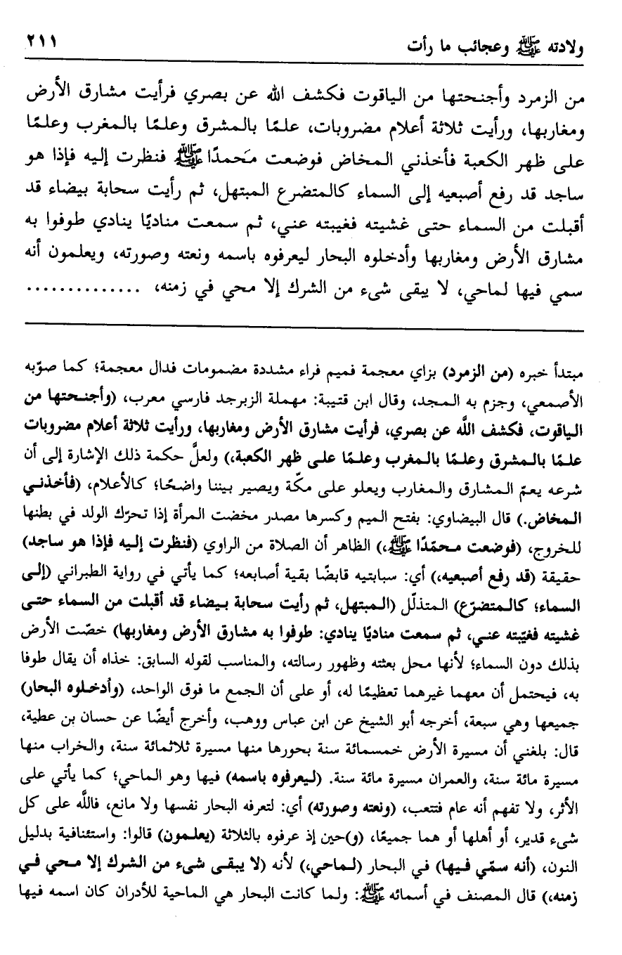 من الزمرد وأجنحتها من الياقوت فكشف الله عن بصري فرأيت مشارق الأرض ومغاربها، ورأيت ثلاثة أعلام مضروبات، علمًا بالمشرق وعلمًا بالمغرب، وعلمًا على ظهر الكعبة فأخذني المخاض فوضعت محمدًا صلى الله عليه وسلم فنظرت إليه فإذا هو ساجد قد رفع أصبعيه إلى السماء كالمتضرع المبتهل، ثم رأيت سحابة بيضاء قد أقبلت من السماء حتى غشيته فغيبته عني، ثم سمعت مناديًا ينادي طوفوا به مشارق الأرض ومغاربها وأدخلوه البحار ليعرفوه باسمه ونعته وصورته، ويعلمون أنه سمي فيها الماحي، لا يبقي شيء من الشرك إلا محي في زمنه.......................
