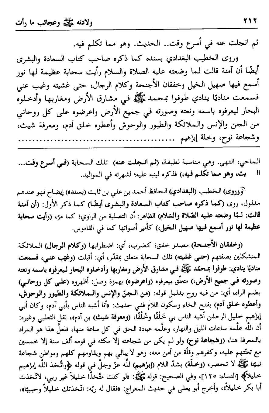 وروى الخطيب البغدادي بسنده كما ذكره صاحب كتاب السعادة والبشرى أيضًا أن آمنة قالت لما وضعته عليه الصلاة والسلام رأيت سحابة عظيمة لها نور أسمع فيها صهيل الخيل وخفقان الأجنحة وكلام الرجال، حتى غشيته وغيب عني فسمعت مناديًا طوفوا بمحمد صلى الله عليه وسلم في مشارق الأرض ومغاربها وأدخلوه البحار ليعرفوه باسمه ونعته وصورته في جميع الأرض واعرضوه على كل روحاني من الجن والإنس والملائكة والطيور والوحوش وأعطوه خلق آدم، ومعرفة شيث، وشجاعة نوح، وخلة إبراهيم.............................