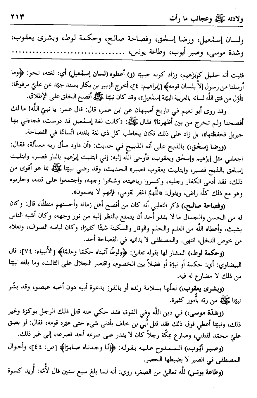 ولسان إسماعيل، ورضا إسحاق، وفصاحة صالح، وحكمة لوط، وبشرى يعقوب، وشدة موسى، وصبر أيوب، وطاعة يونس............................
