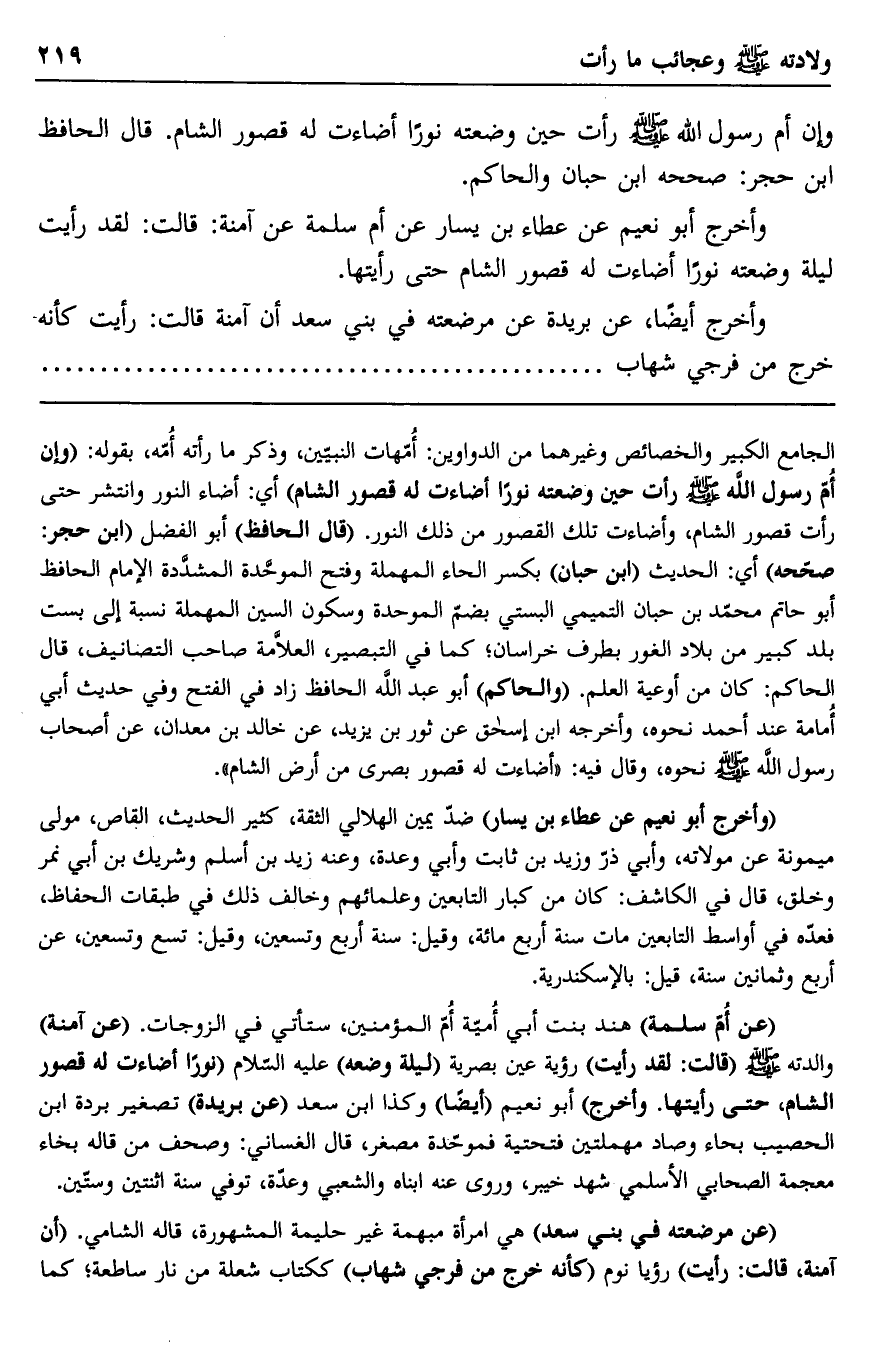 وإن أم رسول الله صلى الله عليه وسلم رأت حين وضعته نورًا أضاءت له قصور الشام. قال الحافظ ابن حجر: صححه ابن حبان والحاكم.