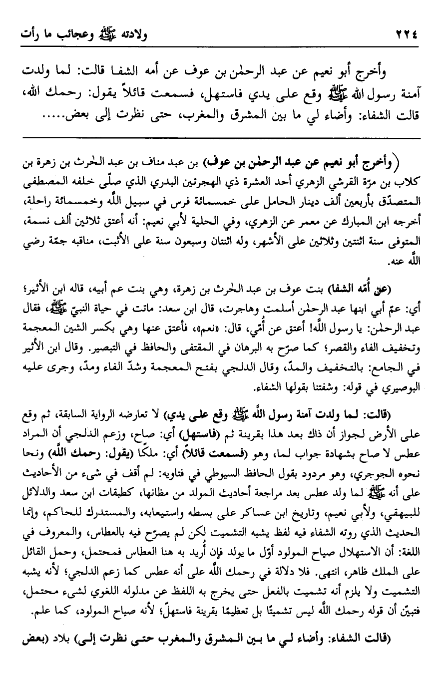 وأخرج أبو نعيم عن عبد الرحمن بن عوف عن أمه الشفا قالت: لما ولدت آمنة رسول الله صلى الله عليه وسلم وقع على يدي فاستهل، فسمعت قائلا يقول: رحمك الله، قالت الشفاء: وأضاء لي ما بين المشرق والمغرب، حتى نظرت إلى بعض.................