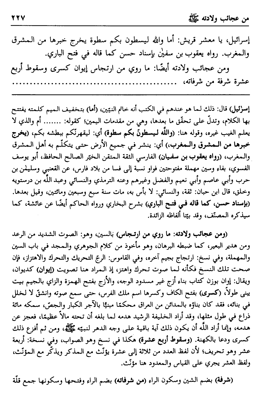 "ومن عجائب ولادته: ما روي من ارتجاس" بالسين، وهو: الصوت الشديد من الرعد ومن هدير البعير، كما ضبطه البرهان، وهو مأخوذ من كلام الجوهري والمجد في باب السين والمهملة، وفي نسخ: ارتجاج بجيم آخره، وفي القاموس: الرج التحريك والتحرك والاهتزاز، فإن صحت تلك النسخ فكأنه لما صوت تحرك واهتز، إذ المراد هنا تصويت "إيوان" كديوان، ويقال: إوان بوزن كتاب بناء أزج غير مسدود الوجه، والأزج بفتح الهمزة والزاي بالجيم بيت يبنى طولا، "كسرى" بفتح الكاف وكسرها اسم ملك الفرس، حتى سمع صوته وانشق لا لخلل في بنائه، فقد كان بناؤه بالمدائن من العراق محكمًا مبنيًا بالآجر الكبار والجص، سمكه مائة ذراع في طول مثلها، وقد أراد الخليفة الرشيد هدمه لما بلغه أن تحته مالا عظيمًا، فعجز عن هدمه، وإنما أراد الله أن يكون ذلك آية باقية على وجه الدهر لنبيه صلى الله عليه وسلم، ومن ثم أفزع ذلك كسرى ودعا بالكهنة. "وسقوط أربع عشرة" هكذا في نسخ وهو الصواب، وفي نسخة: أربعة عشر وهو تحريف؛ لأن لفظ العدد من ثلاثة إلى عشرة يؤنث مع المذكر ويذكر مع المؤنث، ولفظ العشر يجري على القياس والمعدود هنا مؤنث.