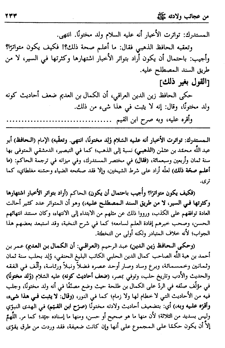 حكى الحافظ زين الدين العراقي، أن الكمال بن العديم ضعف أحاديث كونه ولد مختونًا، وقال: إنه لا يثبت في هذا شيء من ذلك.