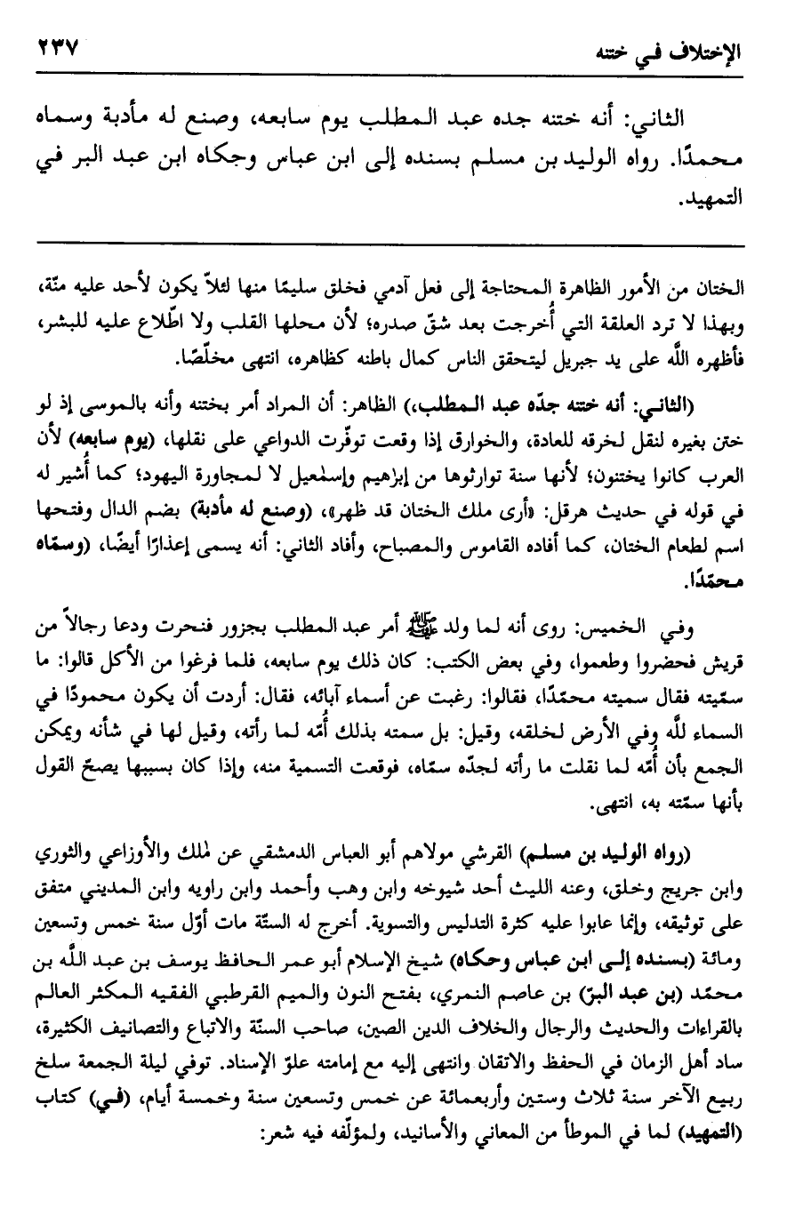 الثاني: أنه ختنه جده عبد المطلب يوم سابعه، وصنع له مأدبة وسماه محمدًا. رواه الوليد بن مسلم بسنده إلى ابن عباس وحكاه ابن عبد البر في التمهيد.