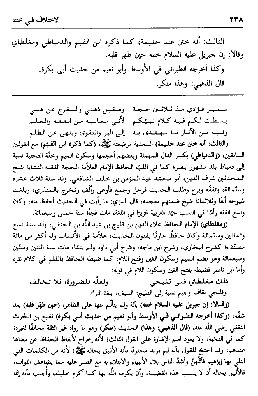 "وقالا: إن جبريل عليه السلام ختنه" بآلة ولم يتألم منها على الظاهر، "حين طهر قلبه" بعد شقه، "وكذا أخرجه الطبراني في الأوسط وأبو نعيم من حديث أبي بكرة" نفيع بن الحارث الثقفي رضي الله عنه، "قال الذهبي: وهذا" الحديث "منكر" وهو ما رواه غير الثقة مخالفًا لغيره؛ كما في النخبة، ولا يعود اسم الإشارة على القول الثالث؛ لأنه إخراج لألفاظ الحفاظ عن معناها عندهم، وقد احتج للقول بأنه لم يولد مختونًا بأنه الأليق بحاله صلى الله عليه وسلم؛ لأنه من الكلمات التي ابتلي بها إبراهيم فأتمهن وأشد الناس بلاء الأنبياء والابتلاء به مع الصبر عليه مما يضاعف الثواب، فالأليق بحاله أن لا يسلب هذه الفضيلة، وأن يكرمه الله بها كما أكرم خليله، وأجيب بأنه إنما