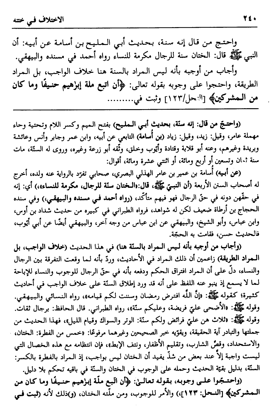 واحتج من قال: إنه سنة، بحديث أبي المليح بن أسامة عن أبيه: أن النبي صلى الله عليه وسلم قال: "الختان سنة للرجال مكرمة للنساء". رواه أحمد في مسنده والبيهقي.