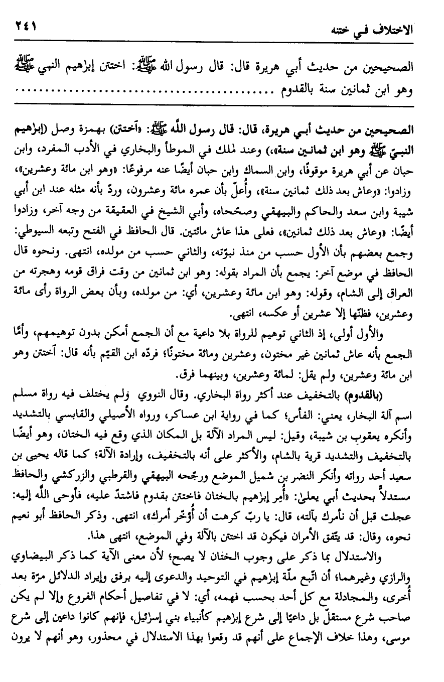 الصحيحين من حديث أبي هريرة قال: قال رسول الله صلى الله عليه وسلم: "اختن" بهمزة وصل "إبراهيم النبي صلى الله عليه وسلم وهو ابن ثمانين سنة". وعند مالك في الموطأ والبخاري في الأدب المفرد، وابن حبان عن أبي هريرة موقوفًا، وابن السماك وابن حبان أيضا عنه مرفوعًا: "وهو ابن مائة وعشرين"، وزادوا: "وعاش بعد ذلك ثمانين سنة"، وأعل بأن عمره مائة وعشرون, ورد بأنه مثله عند ابن أبي شيبة وابن سعد والحاكم والبيهقي وصححاه، وأبي الشيخ في العقيقة من وجه آخر، وزادوا أيضًا: "وعاش بعد ذلك ثمانين" فعلى هذا عاش مائتين. قال الحافظ في الفتح وتبعه السيوطي: وجمع بعضهم بأن الأول حسب من منذ نبوته، والثاني حسب من مولده، انتهى. ونحوه قال الحافظ في موضع آخر: يجمع بأن المراد بقوله: وهو ابن ثمانين من وقت فراق قومه وهجرته من العراق إلى الشام، وقوله: وهو ابن مائة وعشرين، أي: من مولده، وبأن بعض الرواة رأى مائة وعشرين، فظنها إلا عشرين أو عكسه، انتهى.
