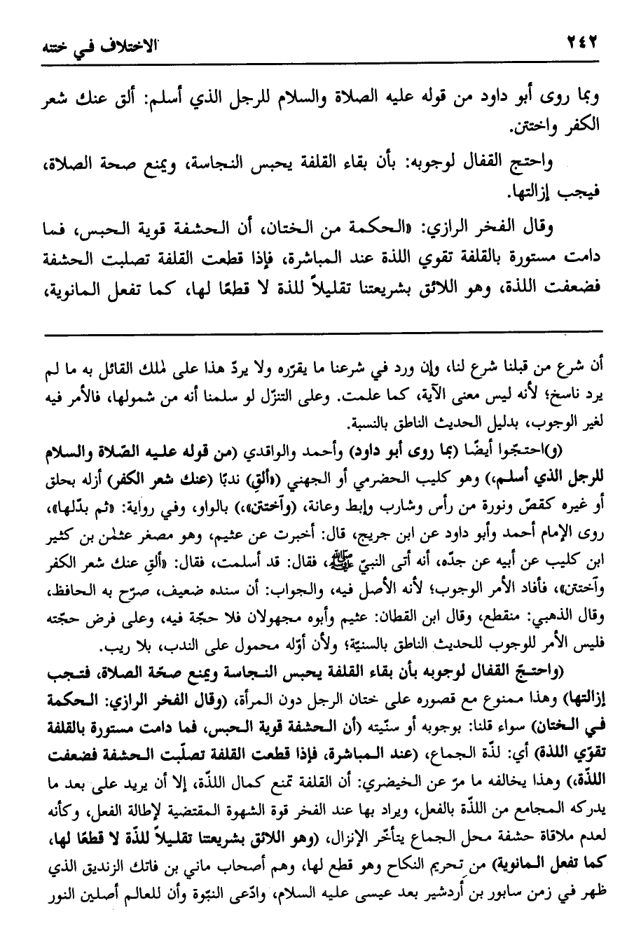 وقال الفخر الرازي: "الحكمة من الختان، أن الحشفة قوية الحبس، فما دامت مستورة بالقلفة تقوي اللذة عند المباشرة، فإذا قطعت القلفة تصلبت الحشفة فضعفت اللذة، وهو اللائق بشريعتنا تقليلا للذة لا قطعًا لها، كما تفعل المانوية،