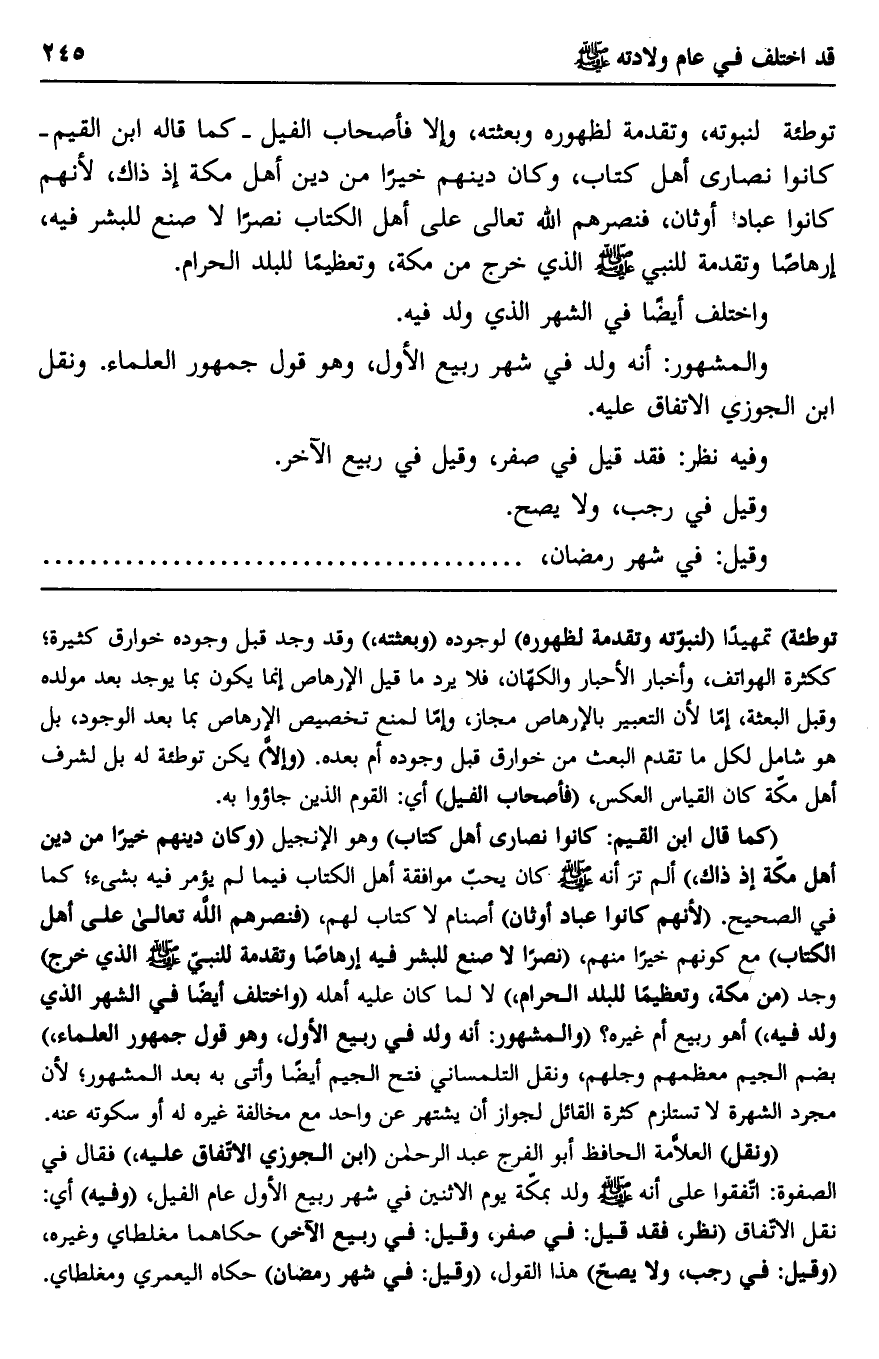 "كما قال ابن القيم: كانوا نصارى أهل كتاب" وهو الإنجيل "وكان دينهم خيرًا من دين أهل مكة إذ ذاك" ألم تر أنه صلى الله عليه وسلم كان يحب موافقة أهل الكتاب فيما لم يؤمر فيه بشيء؛ كما في الصحيح "لأنهم كانوا عباد أوثان" أصنام لا كتاب لهم، "فنصرهم الله تعالى على أهل الكتاب" مع كونهم خيرًا منهم "نصرًا لا صنع للبشر فيه إرهاصًا وتقدمة للنبي صلى الله عليه وسلم الذي خرج" وجد "من مكة، وتعظيمًا للبلد الحرام" لا لما كان عليه أهله "واختلف أيضًا في الشهر الذي ولد فيه" أهو ربيع أم غيره؟ "والمشهور: أنه ولد في ربيع الأول، وهو قول جمهور العلماء" بضم الجيم معظمهم وجلهم، ونقل التلمساني فتح الجيم أيضًا وأتى به بعد المشهور؛ لأن مجرد الشهرة لا تستلزم كثرة القائل لجواز أن يشتهر عن واحد مع مخالفة غيره له أو سكوته عنه.