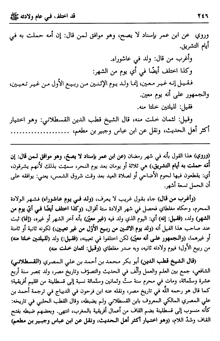 "قال الشيخ قطب الدين" أبو بكر محمد بن أحمد بن علي المصري "القسطلاني" الشافعي، جمع بين العلم والعمل وألف في الحديث والتصوف وتاريخ مصر، ولد بمصر سنة أربع عشرة وستمائة، ومات في محرم سنة ست وثمانين وستمائة نسبة إلى قسطلينة من إقليم أفريقية؛ كما قال هو رحمه الله في تاريخ مصر، ونقله عنه ابن فرحون في الديباج في ترجمة أحمد بن علي المصري المالكي المعروف بابن القسطلاني ولم يضبطه، وقال القطب الحلبي في تاريخه: كأنه منسوب إلى قسطلينة بضم القاف من أعمال أفريقية بالمغرب، انتهى، وبعضهم ضبطه بفتح القاف وشد اللام، "وهو اختيار أكثر أهل الحديث، ونقل عن ابن عباس وجبير بن مطعم"