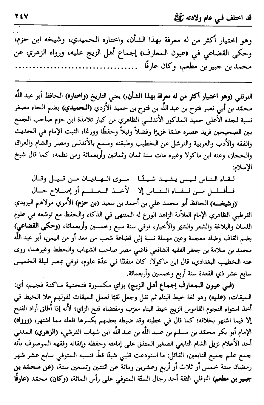 النوفلي "وهو اختيار أكثر من له معرفة بهذا الشأن" يعني التاريخ "واختاره" الحافظ أبو عبد الله محمد بن أبي نصر فتوح بن عبد الله بن فتوح بن حميد الأزدي "الحميدي" بضم الحاء مصغرا نسبة لجده الأعلى حميد المذكور الأندلسي الظاهري من كبار تلامذة ابن حزم صاحب الجمع بين الصحيحين فريد عصره علمًا غزيرًا وفضلا ونبلا وحفظًا وورعًا، الثبت الإمام في الحديث والفقه والأدب والعربية والترسل عن الخطيب وطبقته وسمع بالأندلس ومصر والشام والعراق والحجاز، وعنه ابن ماكولا وغيره مات سنة ثمان وثمانين وأربعمائة ومن نظمه، كما قال شيخ الإسلام: